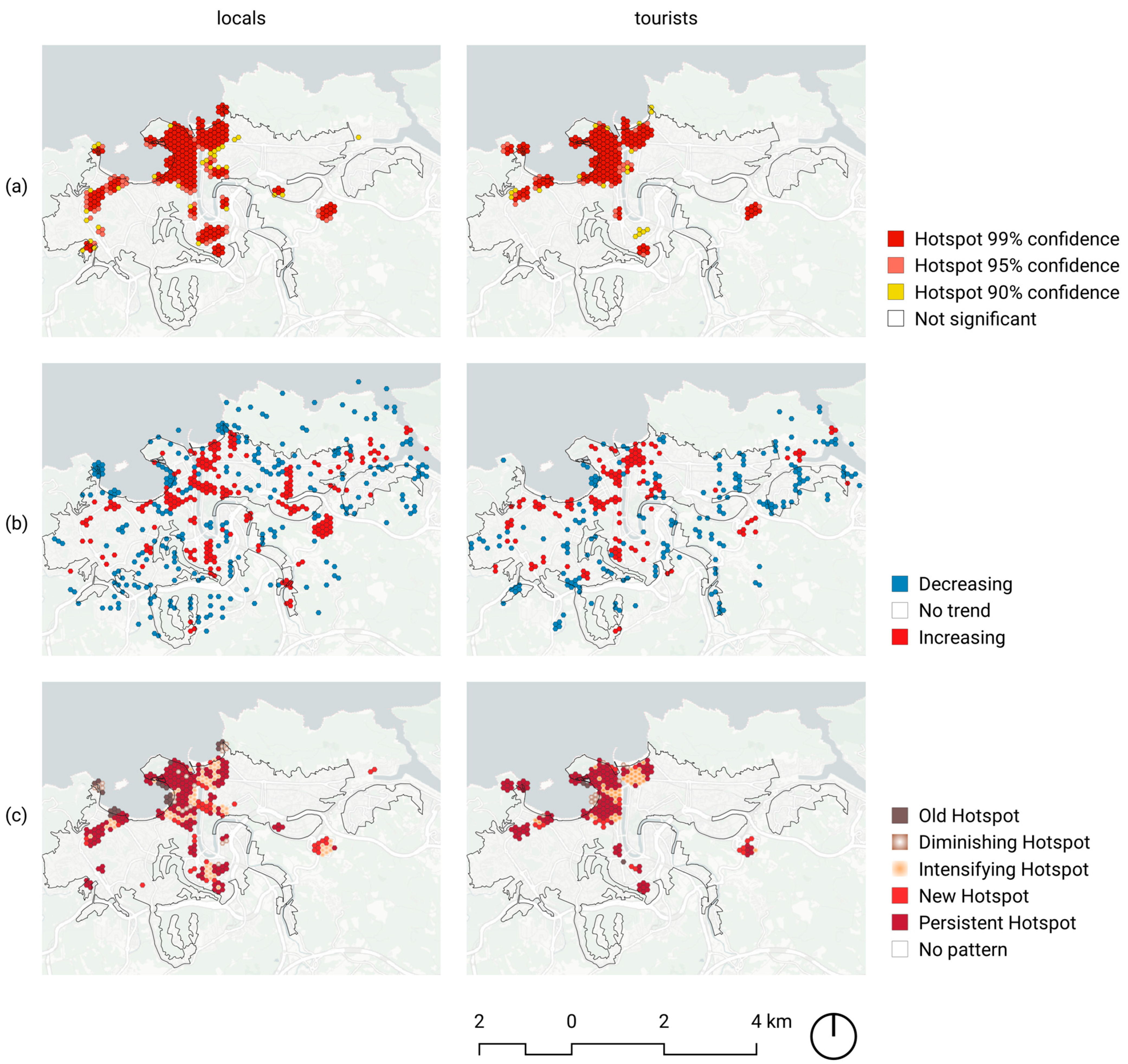 Figure 8. Spatial analysis of urban activity patterns for locals and tourists: (a) Getis-Ord Gi* analysis identifying statistically significant hotspots of activity, (b) temporal trends based on the Mann-Kendall test, and (c) spatiotemporal clusters resulting from the combination of spatial intensity and temporal evolution.