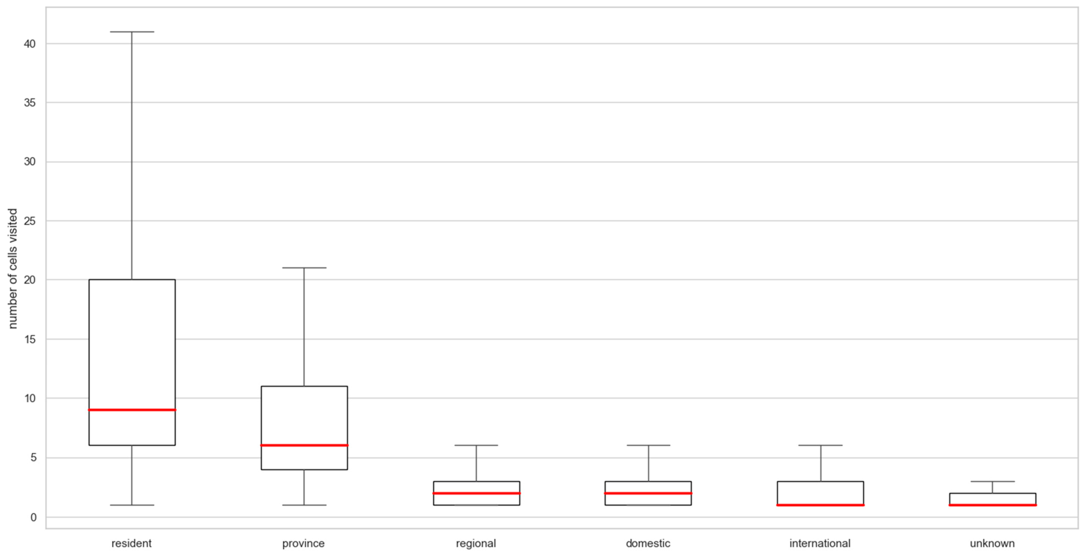 Figure 10. Boxplot of the number of hexagonal cells visited per user by origin, representing the interquartile range, with a red line indicating the median number of cells visited. Whiskers extend to the most extreme values within 1.5 times the interquartile range, and outliers are excluded for clarity.