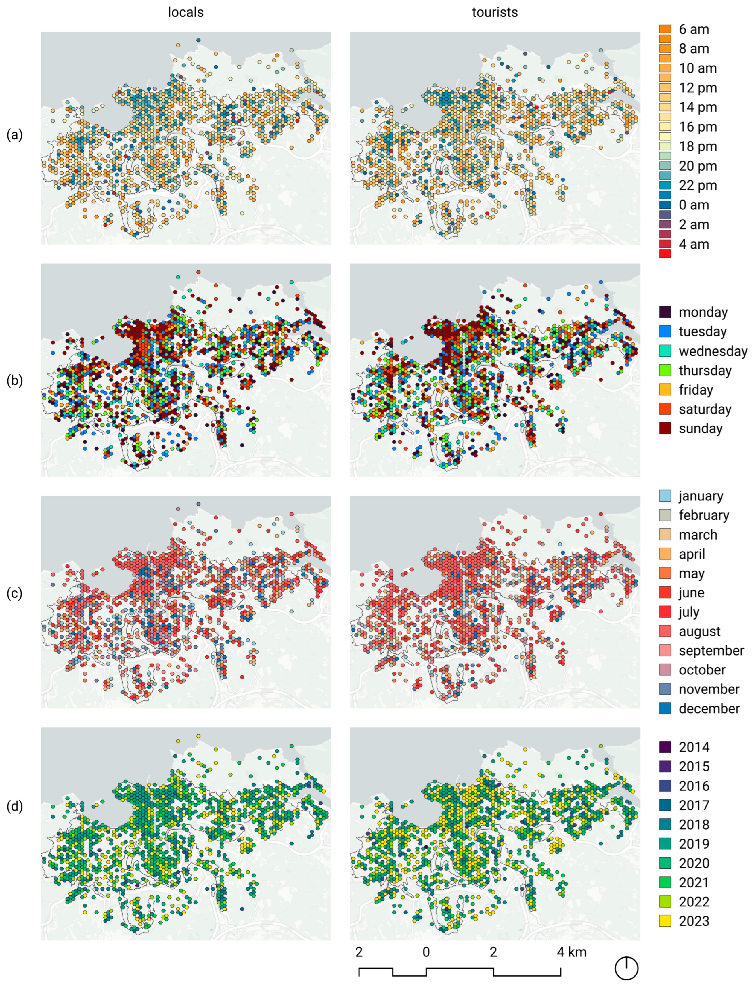 Figure 11. Spatial distribution of predominant temporal patterns in the number of locals and tourists, according to four temporal dimensions: (a) hour of day, (b) day of week, (c) month, and (d) year.