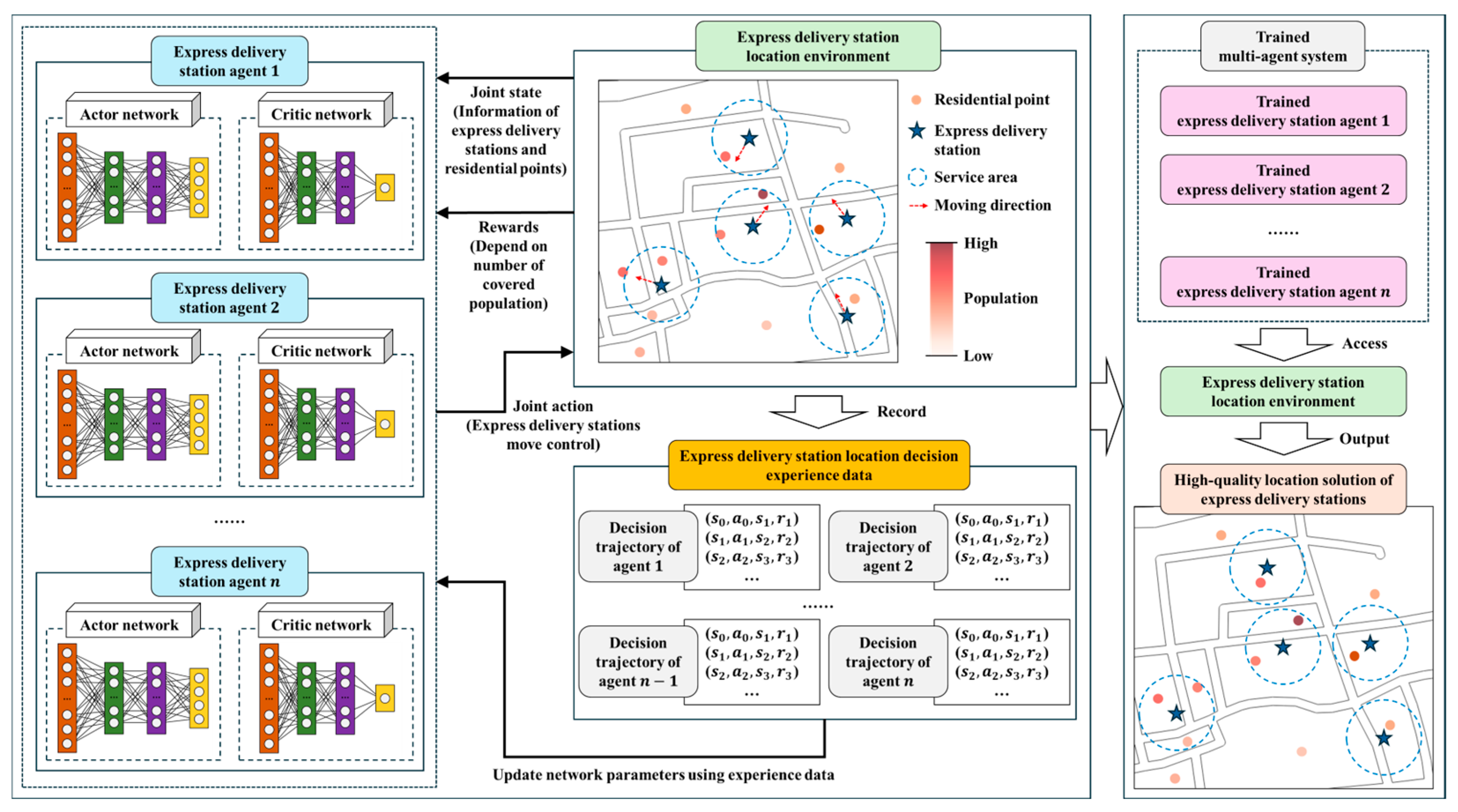Each EDS agent obtains the state of its own station, neighboring stations, and residential points from the environment. By controlling the movement of the station, the agent interacts with the location environment, updates the state information, and obtains a reward based on the population covered by the station’s service area. The greater the population covered within the station’s service area, the higher the reward value the agent receives. By collecting the trajectory (experience data) from the sequential decisions made by all agents while controlling the movement of their stations in the environment, and conducting multiple rounds of learning, the parameters of actor and critic networks are updated. Through this process, each agent gradually improves its actor network to learn effective station placement policy and its critic network to develop a reasonable value assessment system for station locations. Thus, through multi-agent collaboration, it generates a high-quality EDS location planning solution.