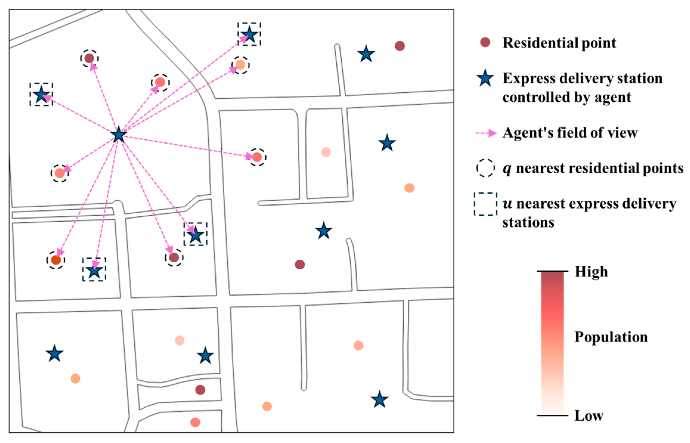 (3) We design an agent environmental perception and reward feedback mechanism for heterogeneous demand distribution scenarios. Agents perceive and focus on surrounding environmental information through local observations to improve training efficiency. A reward model combining local and global components is designed to encourage the multi-agent system to balance local optimization with global location benefits, helping to avoid local optimal solutions while continuously optimizing the global location scheme.