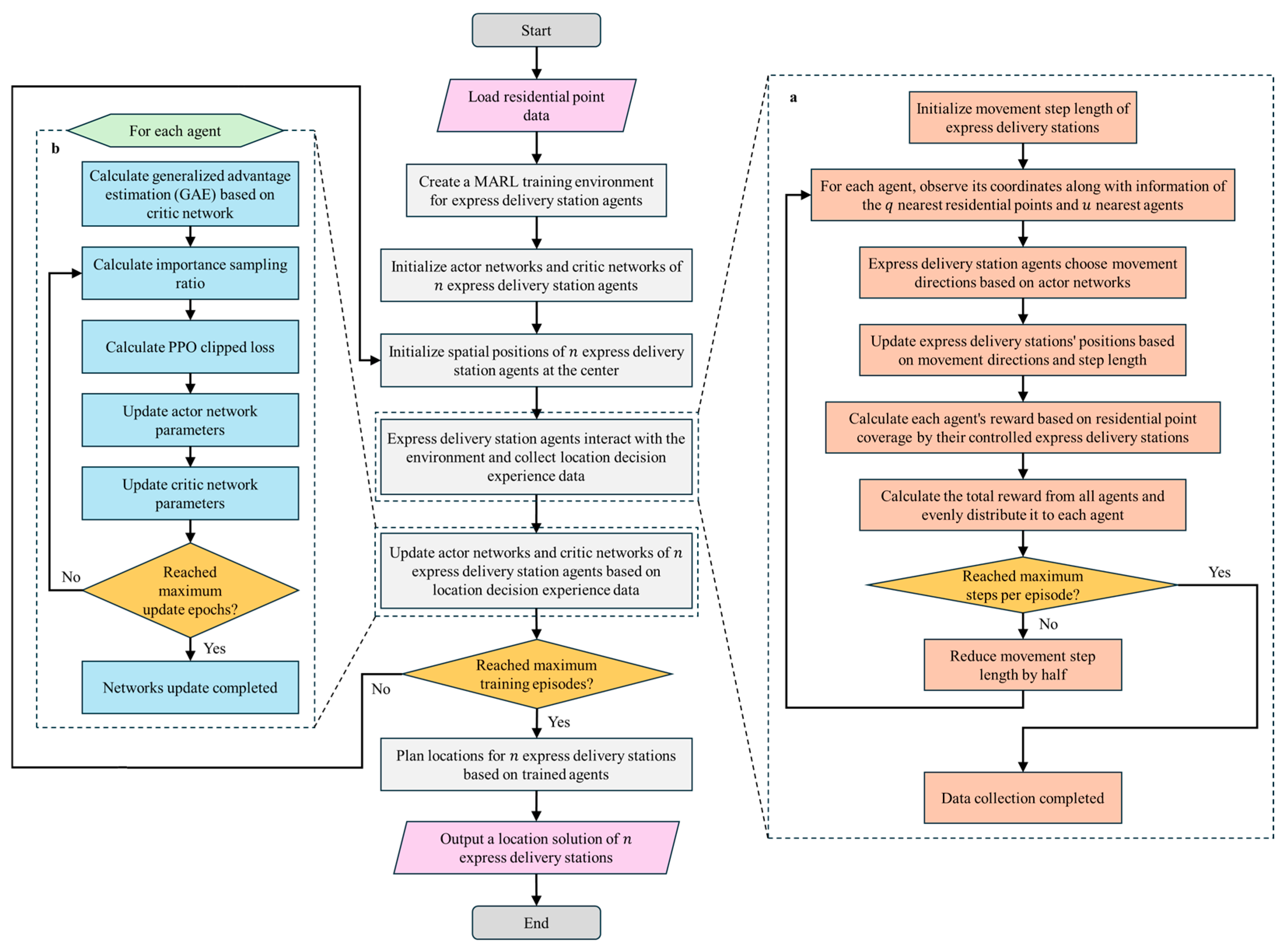Flowchart of EDS location planning method based on MARL framework. a Multiple agents interact with the environment to acquire location decision experience data, b Update the network parameters of multiple agents based on the location decision experience data.