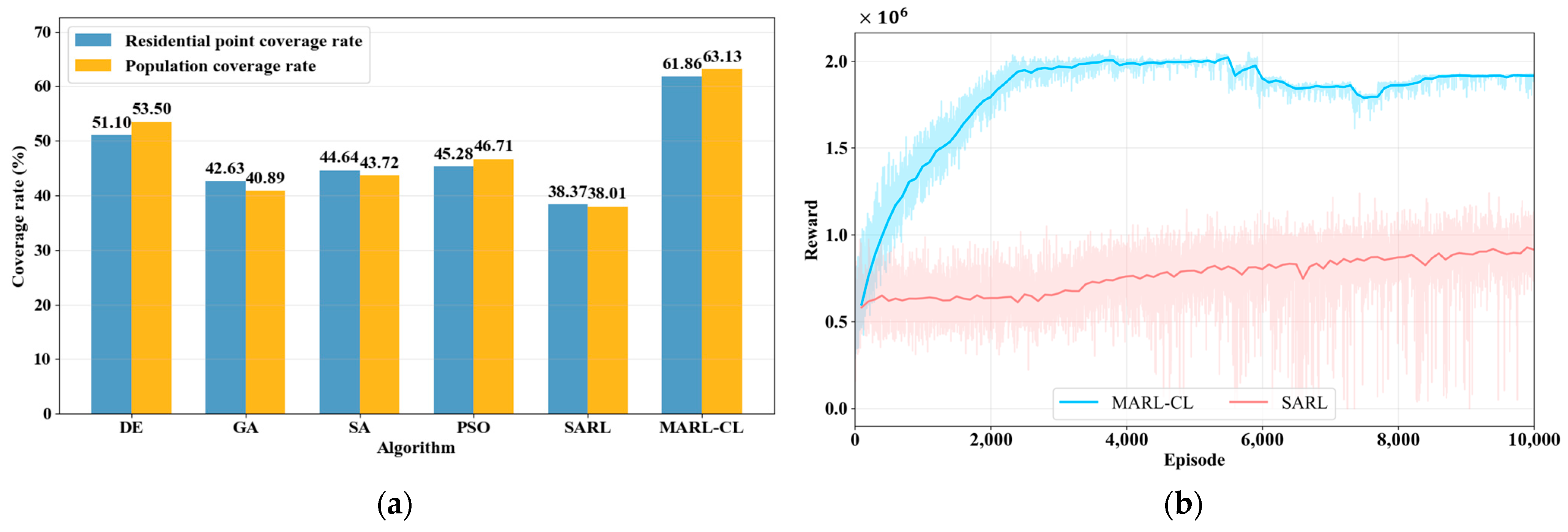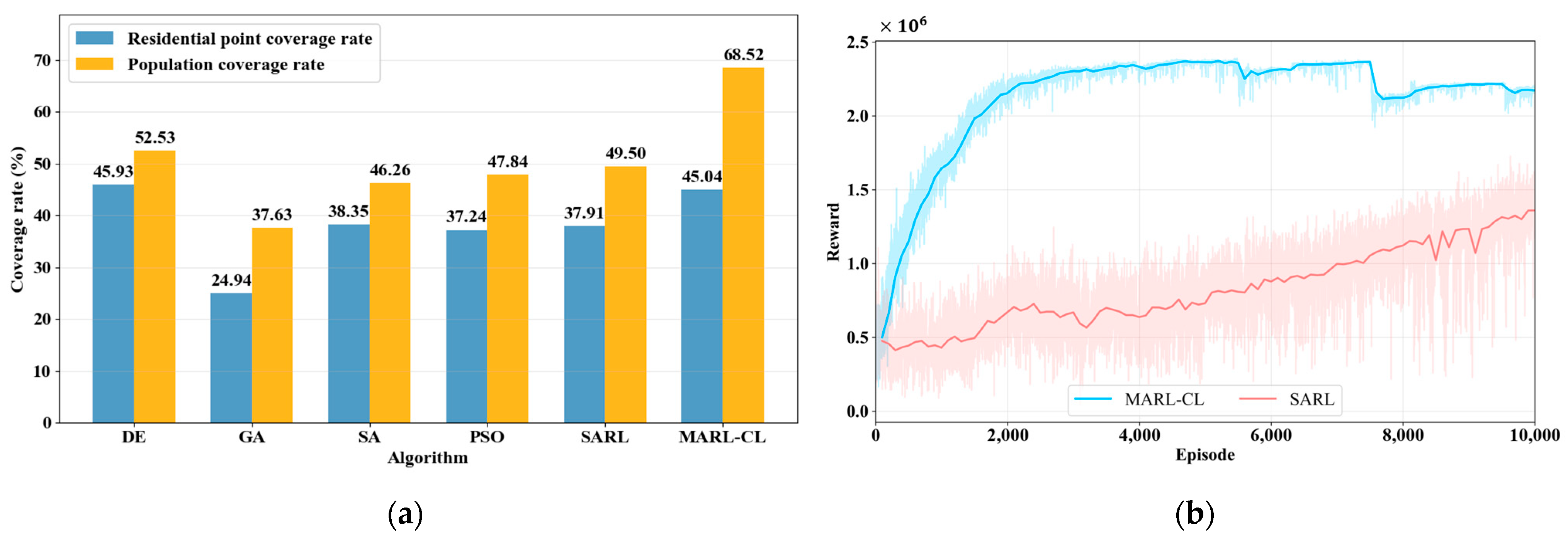 Performance comparison of continuous maximum coverage location methods for EDS in Shenzhen’s Futian District. (a) Performance statistics of heuristic methods and deep RL methods, (b) Reward curves of deep RL methods over training episodes.