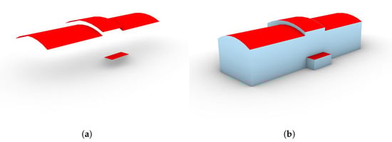To construct the LoD0.3 roof abstraction (i.e., with varying height in case of significant height jumps), the surfaces identified as part of the visible roof structure are grouped and flattened; see Figure 11. Then, the surfaces are trimmed by extruding the roof surfaces downwards to the lowest height of the input model to form solids, which are used to split the flattened isolated roof surfaces.