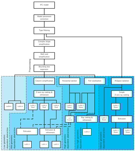 Later on, a few different methods which attempted to extract specific LoDs from BIM models were developed. For example, Donkers et al. [] specifically targets the creation of CityGML LoD3 models. It uses a combination of semantic mapping of equivalent CityGML and IFC classes, geometric transformations based on constructive solid geometry to merge elements, and a process of geometric and semantic refinement to obtain missing surface semantics. There is an open implementation based on the Computational Geometry Algorithms Library (CGAL).