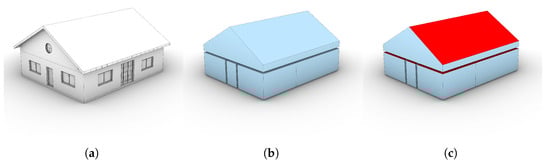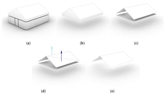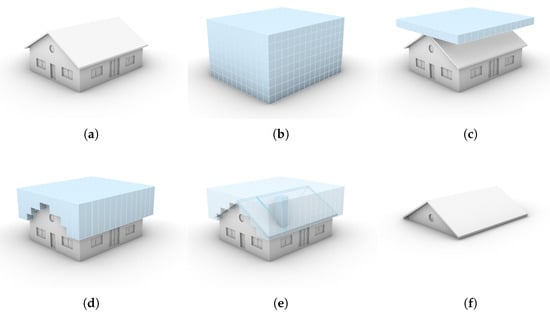 This is followed by a series of abstraction-specific processing steps. These are the processes where the actual abstracted shapes (i.e., geometries) are created. Depending on the required output LoD geometries, certain processing steps are executed while others are omitted. Roughly, the LoD abstraction methods can be grouped into five different levels. These levels are based on how much of the geometry of the input IFC model the methods rely on. The levels of geometric dependency and the individual LoDs generated are presented in Table 1. In addition to the standard LoDs described by Biljecki et al. [], we consider one more useful LoD that consists of the roofing structure of LoD2.2, which we hereafter refer to as LoD0.4; see Figure 4. The IFC elements that the different methods use are shown in Figure 5.