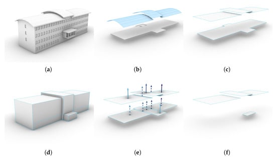 The steps of the LoD0.3 roof abstraction. (a) The model used. (b) The fine filtered roof surfaces (3 groups) that were isolated with the help of column voxelisation and ray casting. (c) These groups are flattened. (d) The surfaces are extruded to ground floor level, and each original un-extruded surface is split with the extruded shapes that intersect it. (e) The split surfaces are filtered with the help of a ray casting process, solid arrows do not intersect, dotted ones do intersect. (f) The resulting LoD0.3 surfaces.