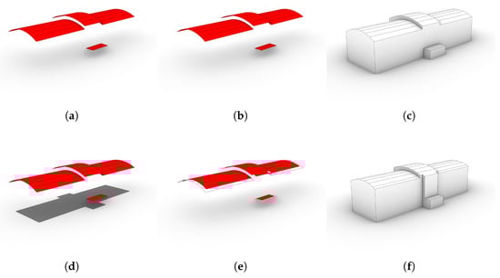 The difference between roof-structure-based LoD2.2 creation (a–c) and footprint-restricted LoD2.2 creation (d–f). The column (a,d) shows the input geometry required. The column (b,e) shows the faces used for downward extrusion in red. It can be seen that some surfaces are not used for footprint-based extraction (in white); these are parts of the roof surfaces that extend over the footprint. The column (c,f) shows the resulting shapes.