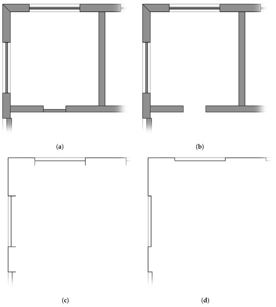 Before the computation of the desired LoD abstraction output, our methodology always starts with a preprocessing step, which reduces the data’s complexity to ease the next steps. In this preprocess, the model’s placement is optimised, the objects required for the processes are selected, and complex objects (doors and windows) are simplified.