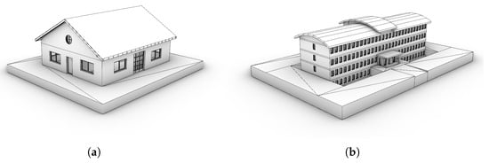The CityGML standard, in its versions up to 2.0 [], introduced an abstraction framework consisting of five levels of detail (LoDs) ranging from LoD0 to LoD4. In the case of buildings, LoD0 is a 2.5D representation of the building’s footprint or roof area (roofprint), LoD1 is a prismatic blocks with flat roofs, LoD2 adds the building’s roof structures and surface semantics, LoD3 is a detailed architectural models of the building’s exterior, and LoD4 is a detailed architectural model that also includes the interior.
