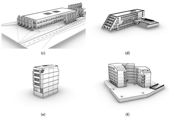 The different models that are used to evaluate the performance of the developed methods. (a) AC20-FZK-Haus model, (b) AC20-Institute-Var-2, (c) FM_ARC_DigitalHub, (d) PRAHA_GO_V5, (e) Demo_Lisbon_2025, (f) Demo_Ascoli Piceno_v2. The figures representing these models are not to the same scale.