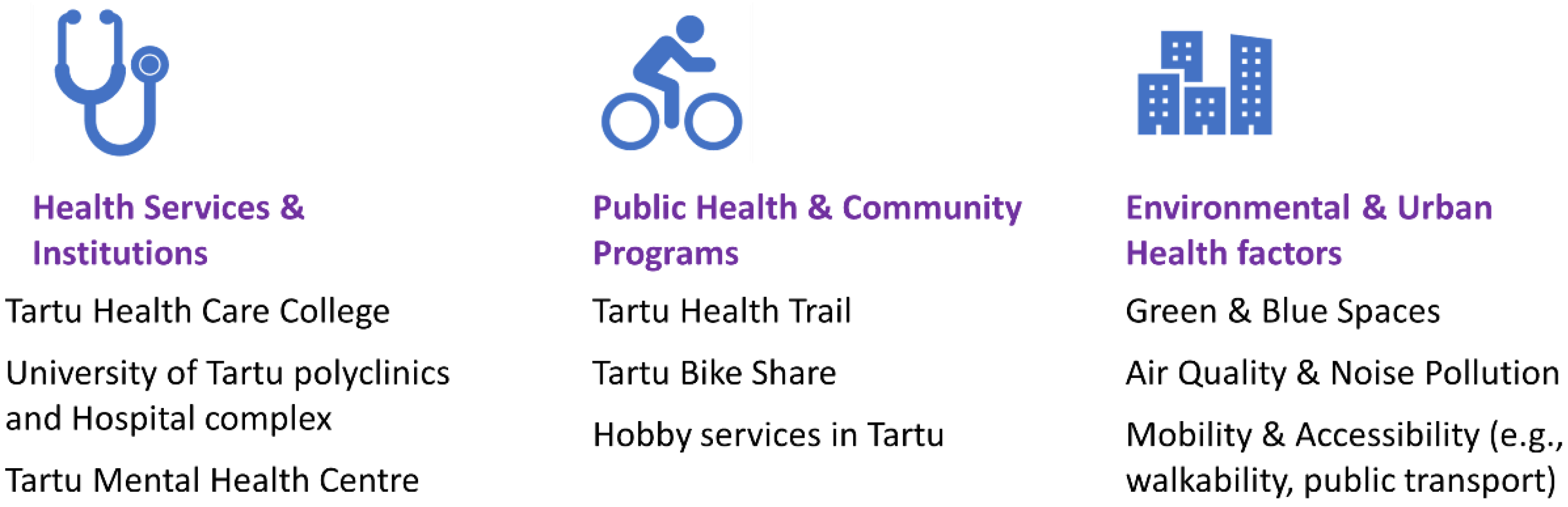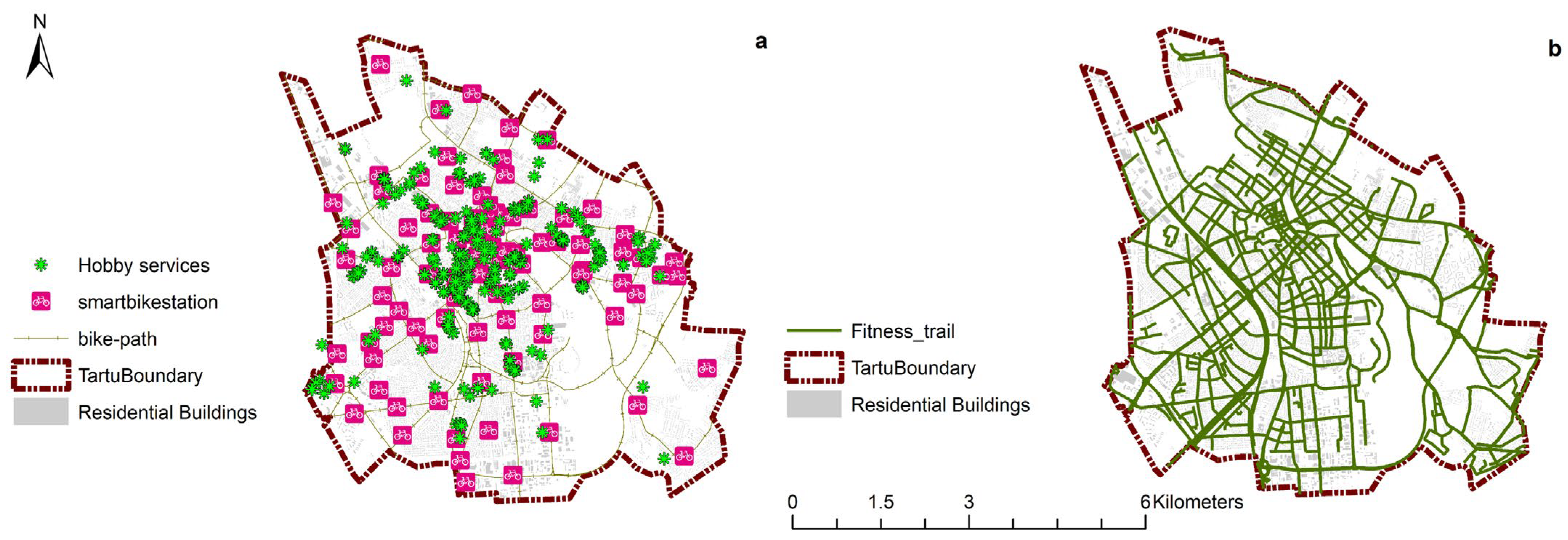 | Public Health Amenities & Mobility Infrastructure | Digitized locations of the Tartu Health Trail & walkable pathway networks, bike-share stations & roots, bicycle lanes, pedestrian paths, and hobby centers (e.g., sports or fitness venues). | Tartu city government geoportal, OpenStreetMap |