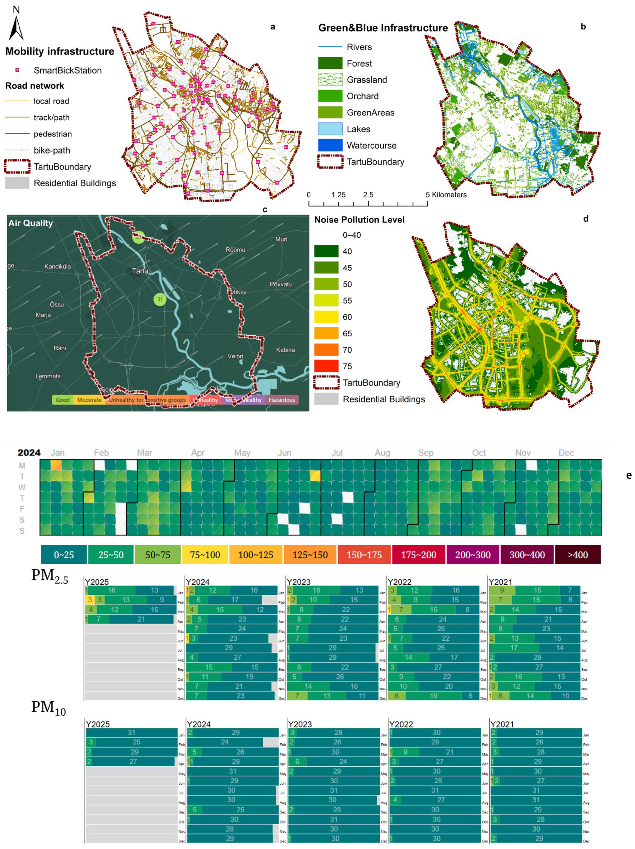 | Environmental Health Factors | Air Quality: Data on PM2.5 and PM10 concentrations (0–75 µg/m3), averaged over the past four years. Noise Pollution: Sound levels in dB, classified from quiet residential zones to moderate urban traffic areas. | Tartu city government geoportal, World Air Quality Historical Database, Estonian Environmental Agency |