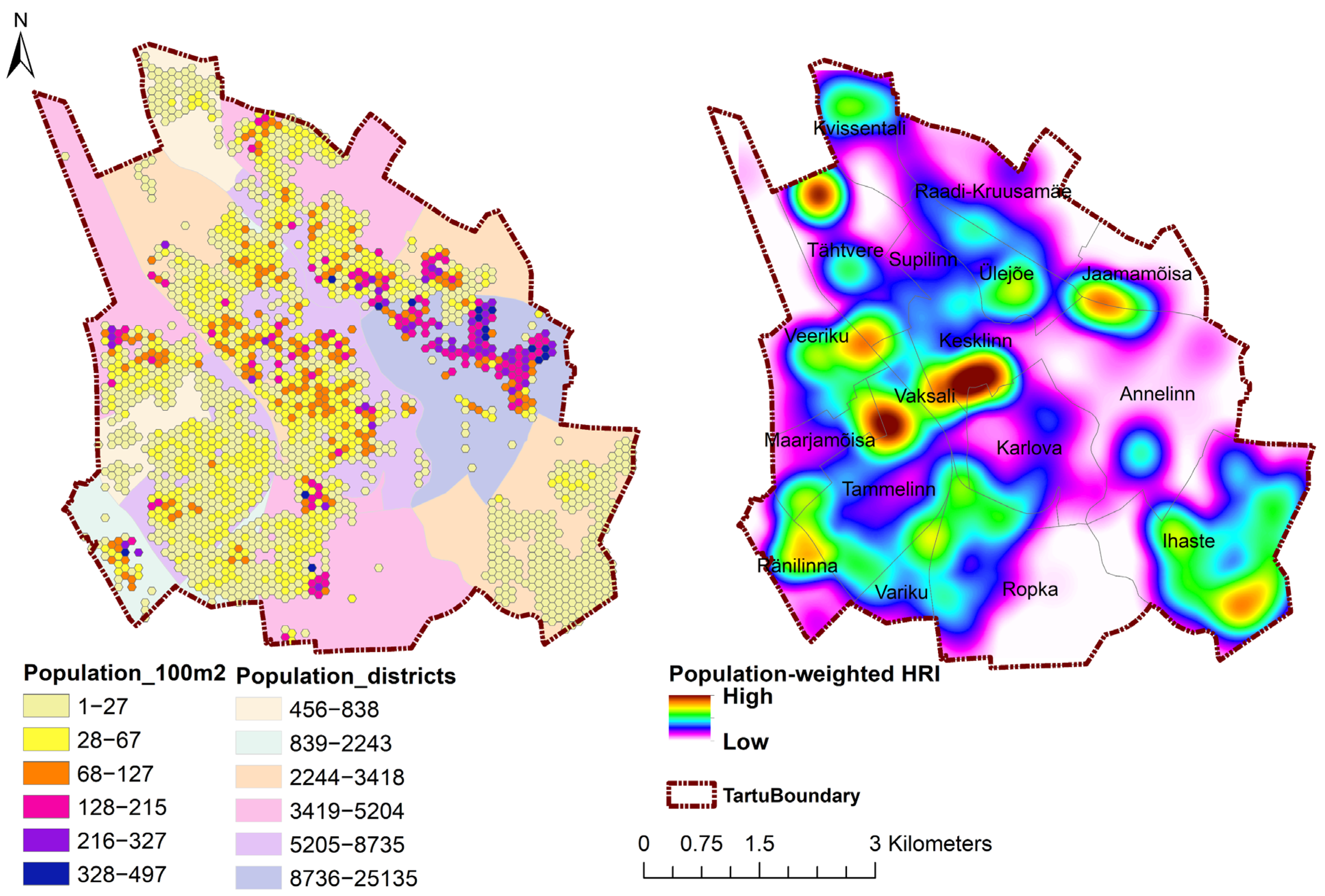 | Population Data | Residential population density, spatialized at hexagonal grids (100 m2), allowing for population-weighted calculations of access and infrastructure equity. | Tartu city government geoportal |