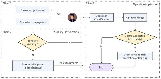 This dual-trigger design explicitly distinguishes between operation-driven and viewport-driven visibility changes, ensuring timely reactivation of relevant operations while avoiding redundant periodic scanning. As a result, the system achieves real-time spatial responsiveness, low computational overhead, and consistent visual coherence across concurrent editing sessions.