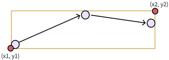The Minimum Bounding Rectangle (MBR) of a geometric primitive is defined as the smallest axis-aligned rectangle that fully encloses it, where and represent the bottom-left and top-right corners of the rectangle, respectively (Figure 3). For consistency across all primitives, each MBR is standardized according to the coordinate convention shown in Figure 1, and denoted as .