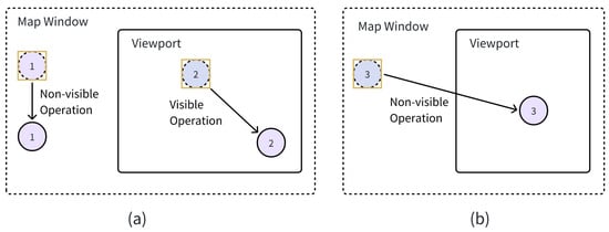 - Visibility Classification: The framework classifies operations as visible or non-visible based on whether the MBR of their target primitive intersects with the current viewport. Visible operations (affecting actively viewed areas) are processed immediately to maintain real-time interactivity, while non-visible operations are deferred to a low-priority queue. This temporal prioritization balances user responsiveness with efficient resource allocation by leveraging strong spatial locality of the geospatial features.