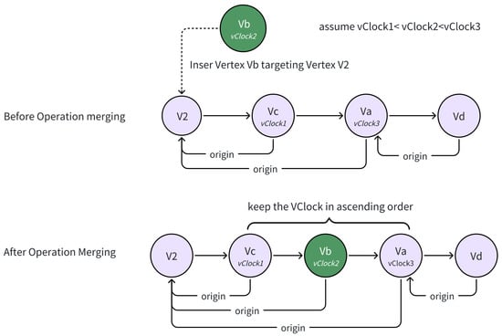 - Insert Vertex operations: When merging an Insert Vertex operation, the proposed algorithm first restricts the traversal scope to nodes sharing the same reference vertex to locate the target insertion position, thereby avoiding unnecessary traversal of irrelevant nodes and optimizing efficiency. Throughout this merging process, the VClock (introduced in Section 4.1) of the inserting node is maintained in ascending order to ensure temporal consistency. As illustrated in Figure 5, vertices Vc and Va are both inserted with V2 as their reference vertex; At this stage, vertex Vb is also to be inserted targeting V2. Due to the VClock attribute relationship of these vertices—where vClock1 (of Vc) < vClock2 (of Vb) < vClock3 (of Va)—Vb is integrated into the existing vertex sequence between Vc and Va.