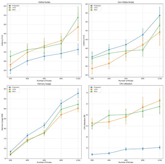 Latency and resource consumption trends across varying node scales (error bars: ±1 STD).