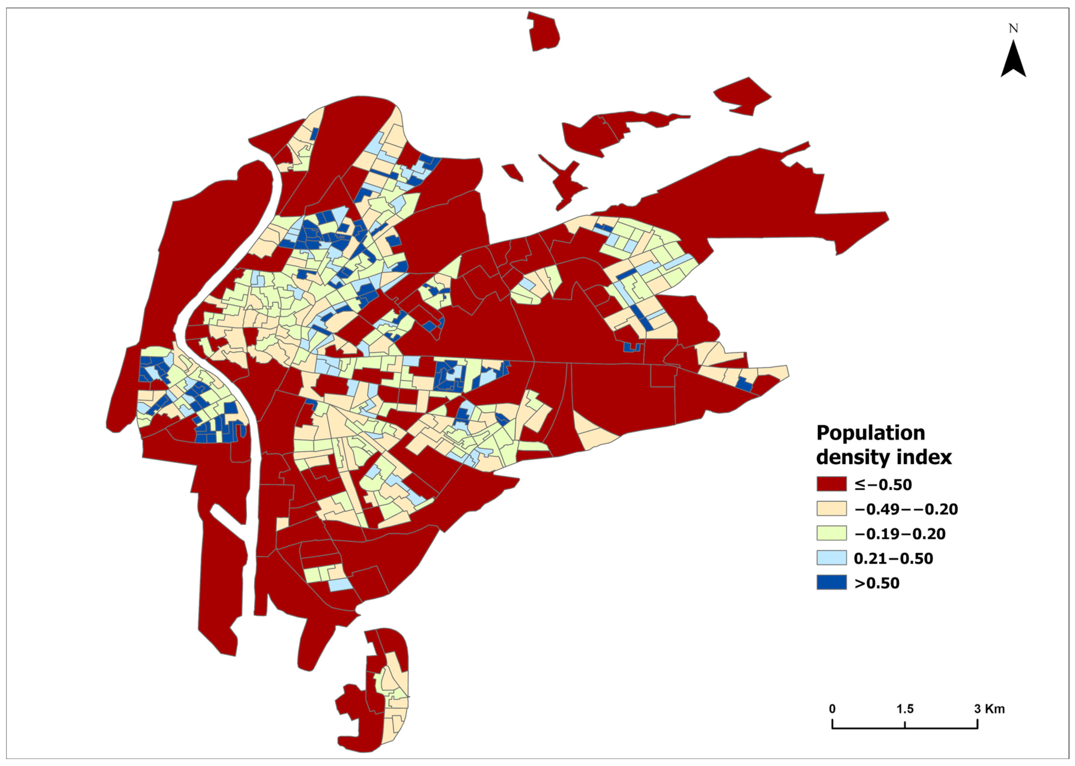 2. This is necessary due to the large size of census sections located on the city’s periphery, where both population and services are concentrated in specific zones, while the remaining area is occupied by industrial estates, technology parks, or transport infrastructures. The second step involved normalizing all the variables, placing different value ranges on the same scale and preparing specific indices to serve as the basis for the final synthetic index. In the followed formula,