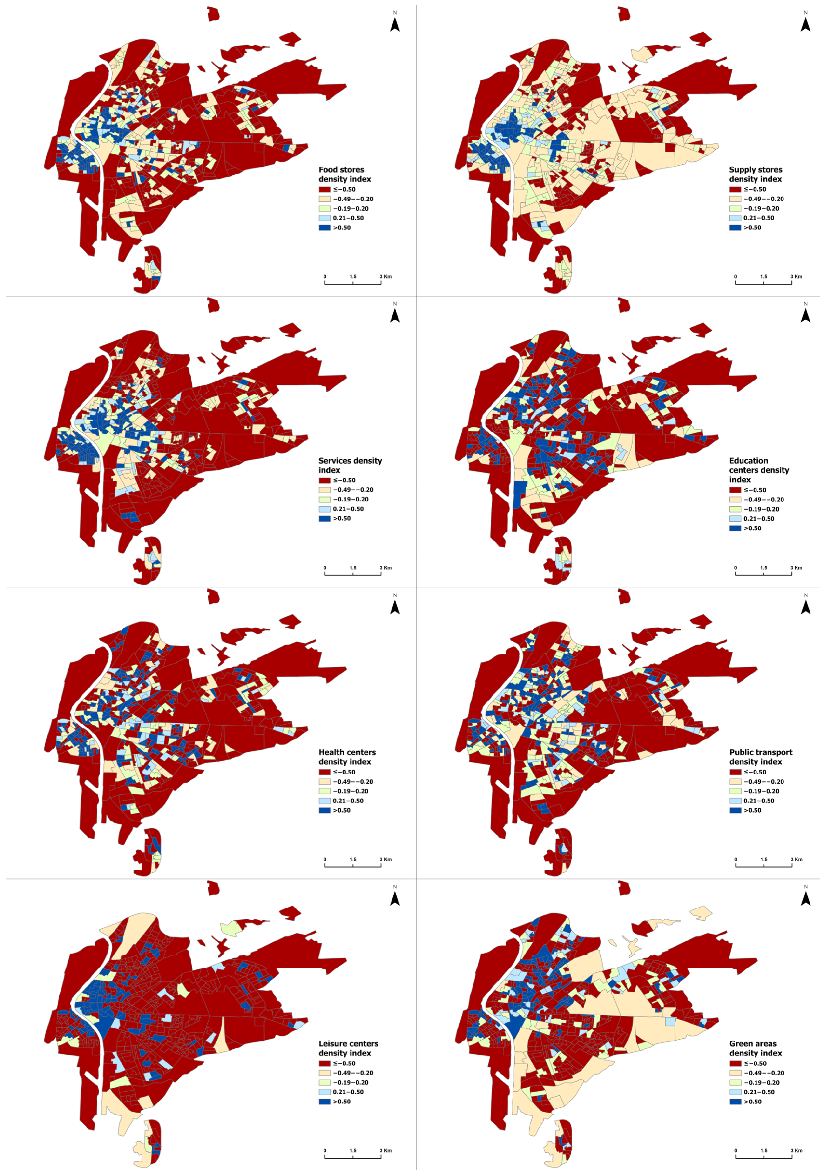 In the most remote districts, education, health, and public-transport centers show a broader distribution, with positive densities, which responds to the isolated nature of outer neighborhoods, configured as small self-sufficient towns within the municipal boundary, though disconnected from the main urban core. This pattern is also repeated in residential neighborhoods in the north, east, and south of the city, where vulnerable neighborhoods with greater service deficits are concentrated.