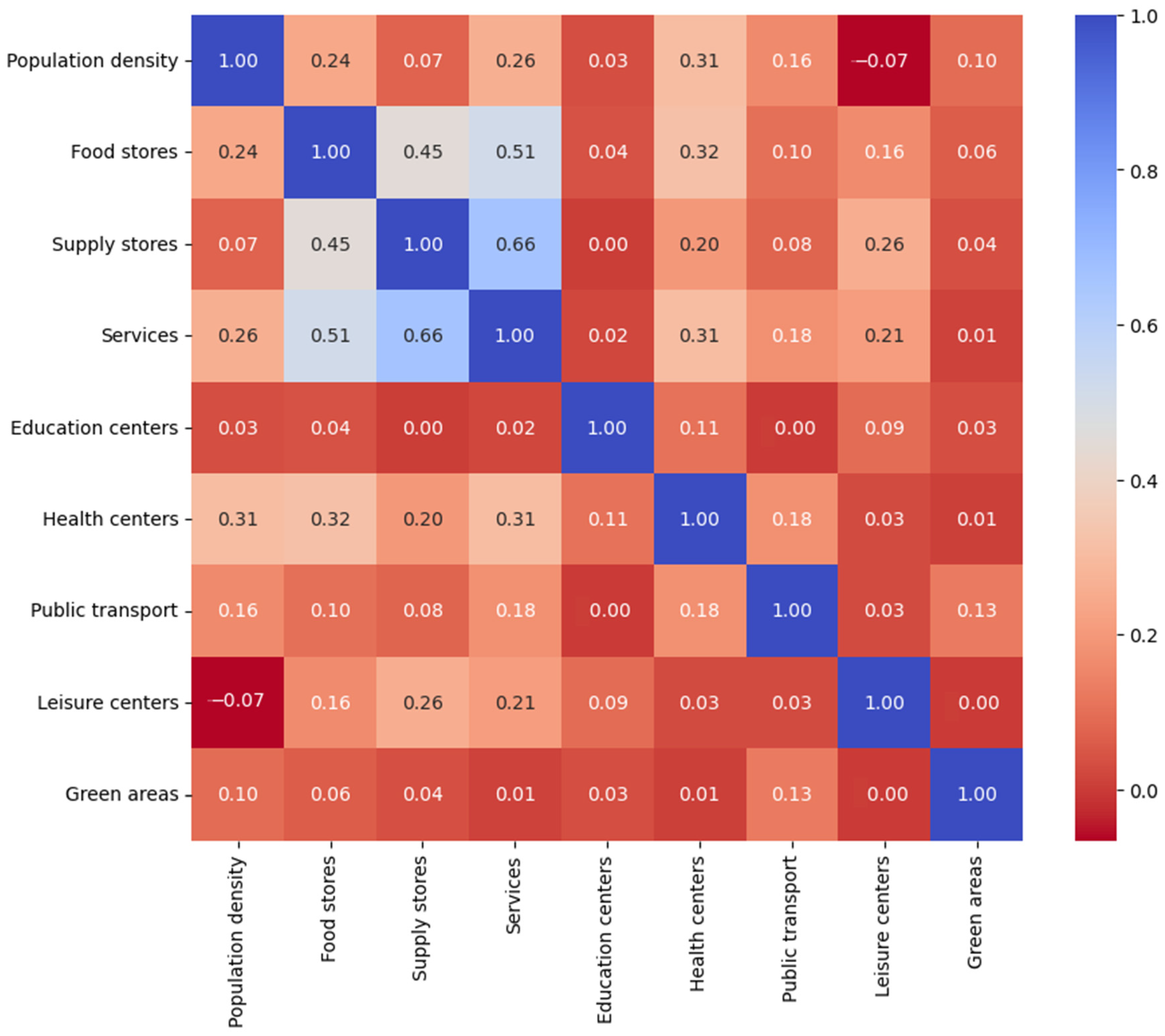 Next, a dual homogenization process was carried out to obtain more robust results. First, both population densities and the number of facilities per category were calculated by dividing their values by the area of each census section measured in km