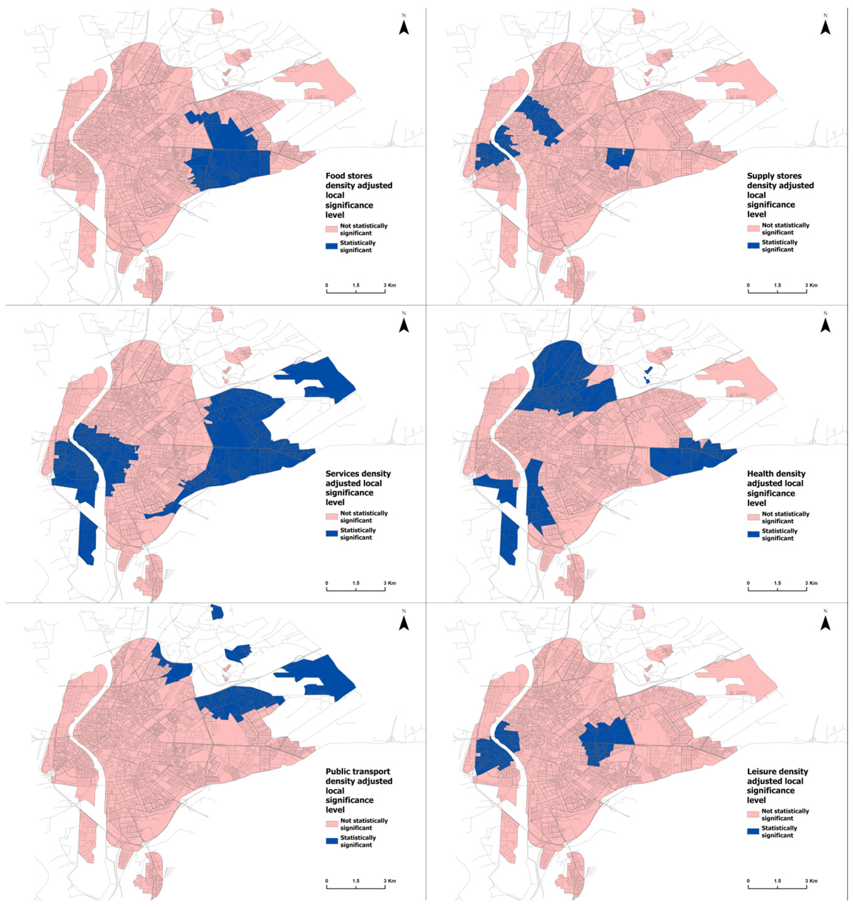 Table 3. Unlike the first GWR model, the absence of spatial autocorrelation in the residuals allows this second model to serve as a theoretical basis for explaining the local effects that either facilitate or hinder the fulfillment of the 15-min city concept in different areas of Seville. The variable for density of commercial facilities includes the total of 8558 obtained facilities, meaning this variable acts as a control factor that distinguishes between the quantity of available facilities and their distribution within access times of less than 15 min.