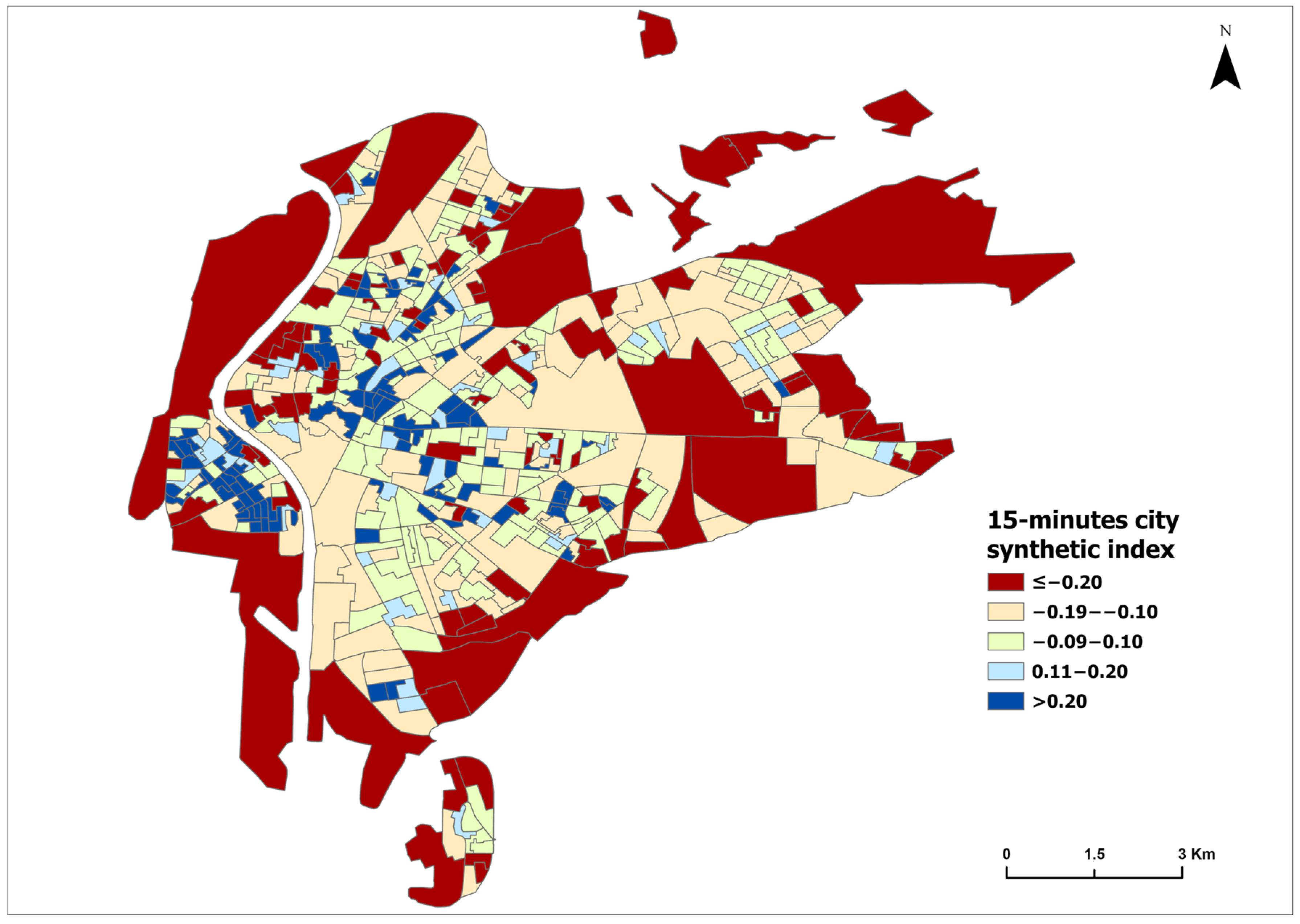 5]. By reproducing patterns described in the literature, the analysis validates the feasibility of using geospatial data infrastructures to operationalize the 15-min city concept.