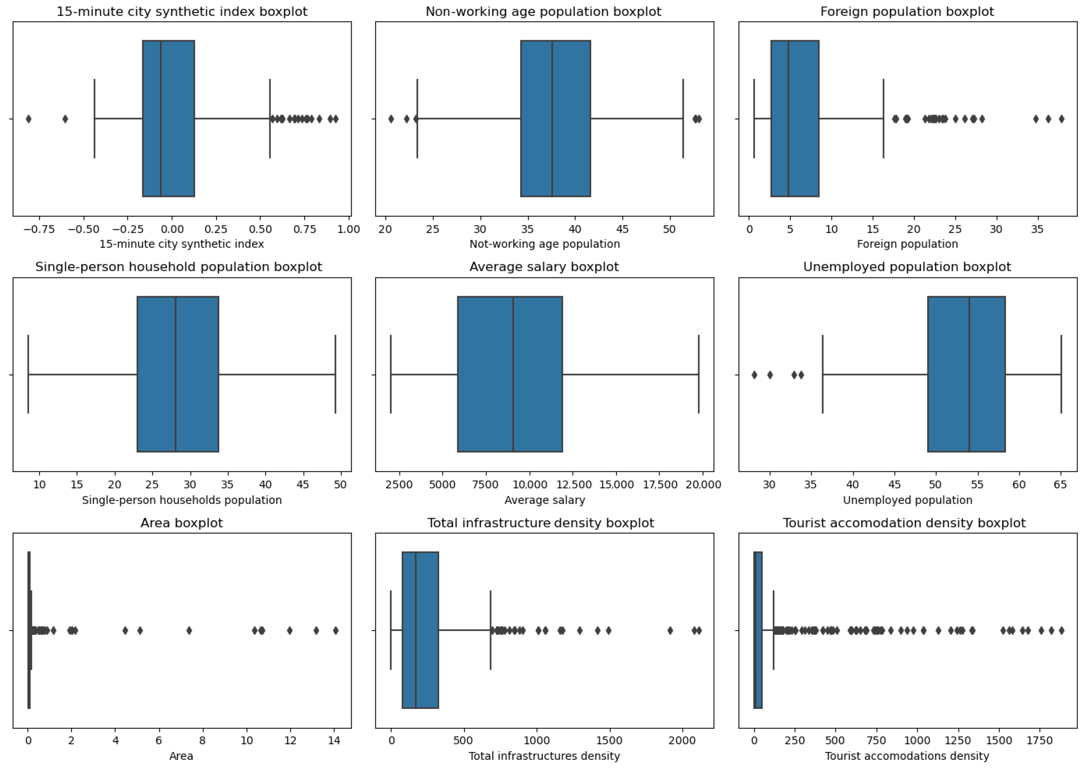 Table 1) were used as dependent variables. Population density is a key structural determinant of urban accessibility and functional proximity, characteristics inherent to 15-min city models. By using population density as the explanatory variable, the model tests whether areas with higher residential concentration offer greater accessibility to everyday urban functions, which aligns with theoretical and empirical evidence from urban studies.