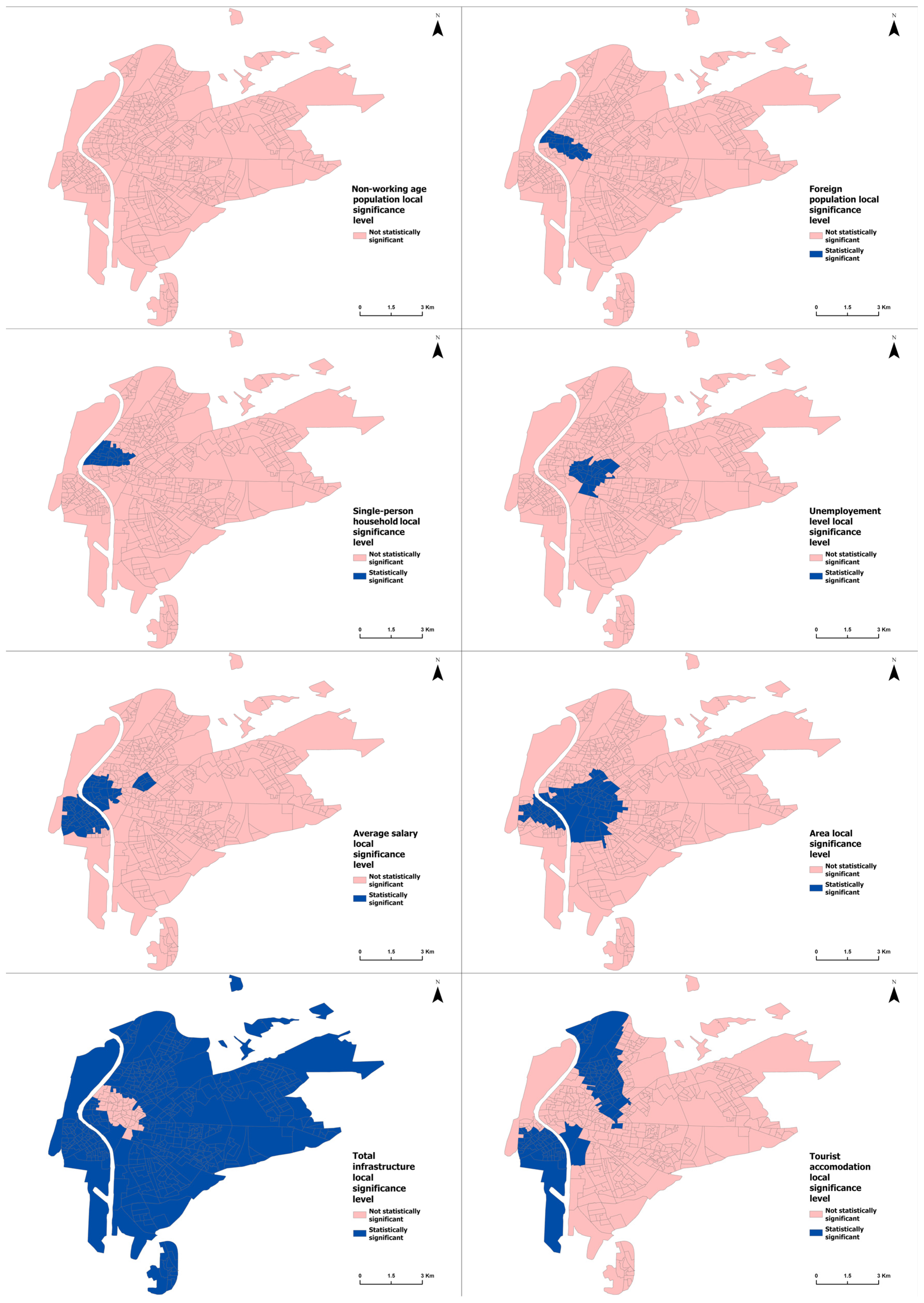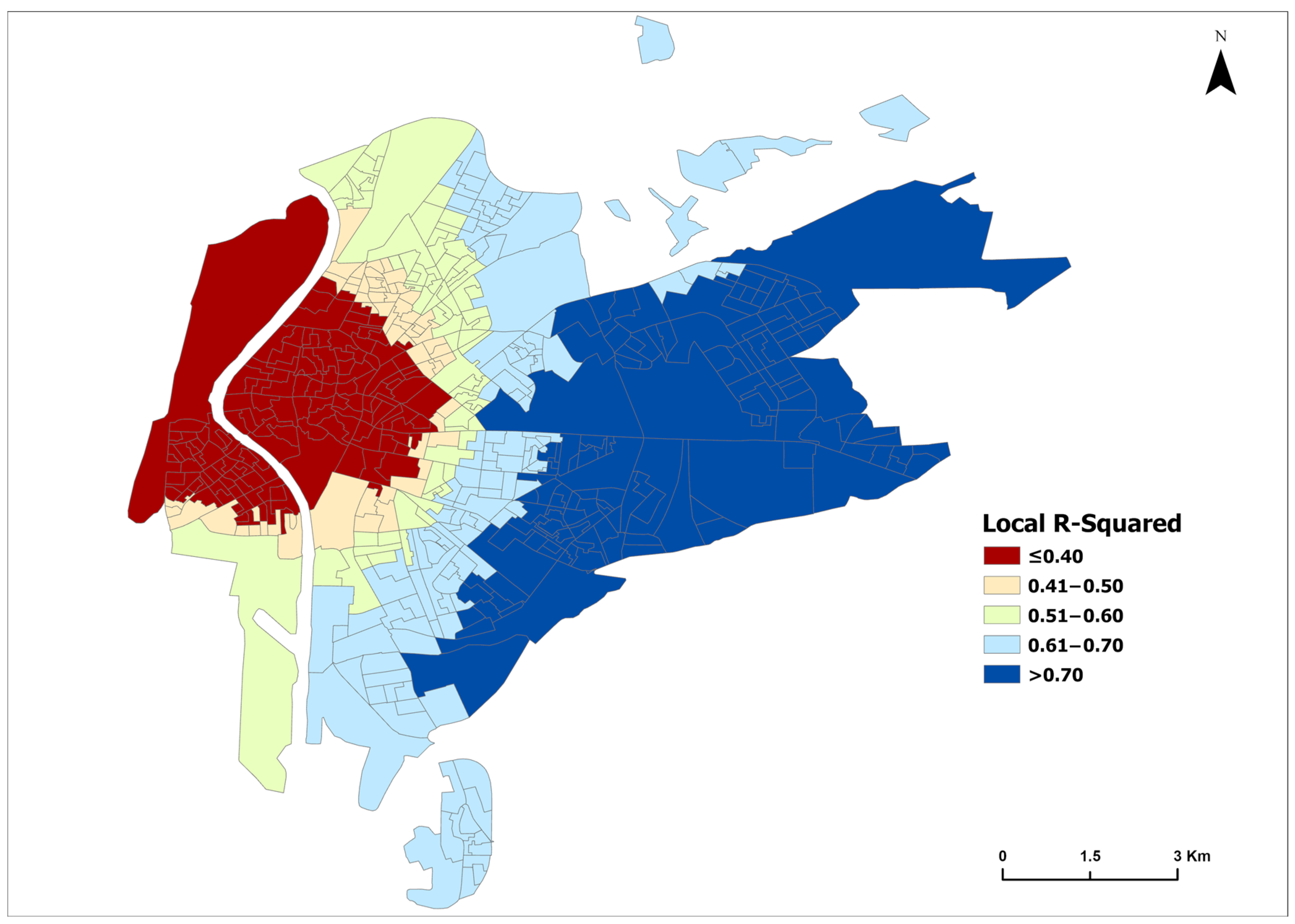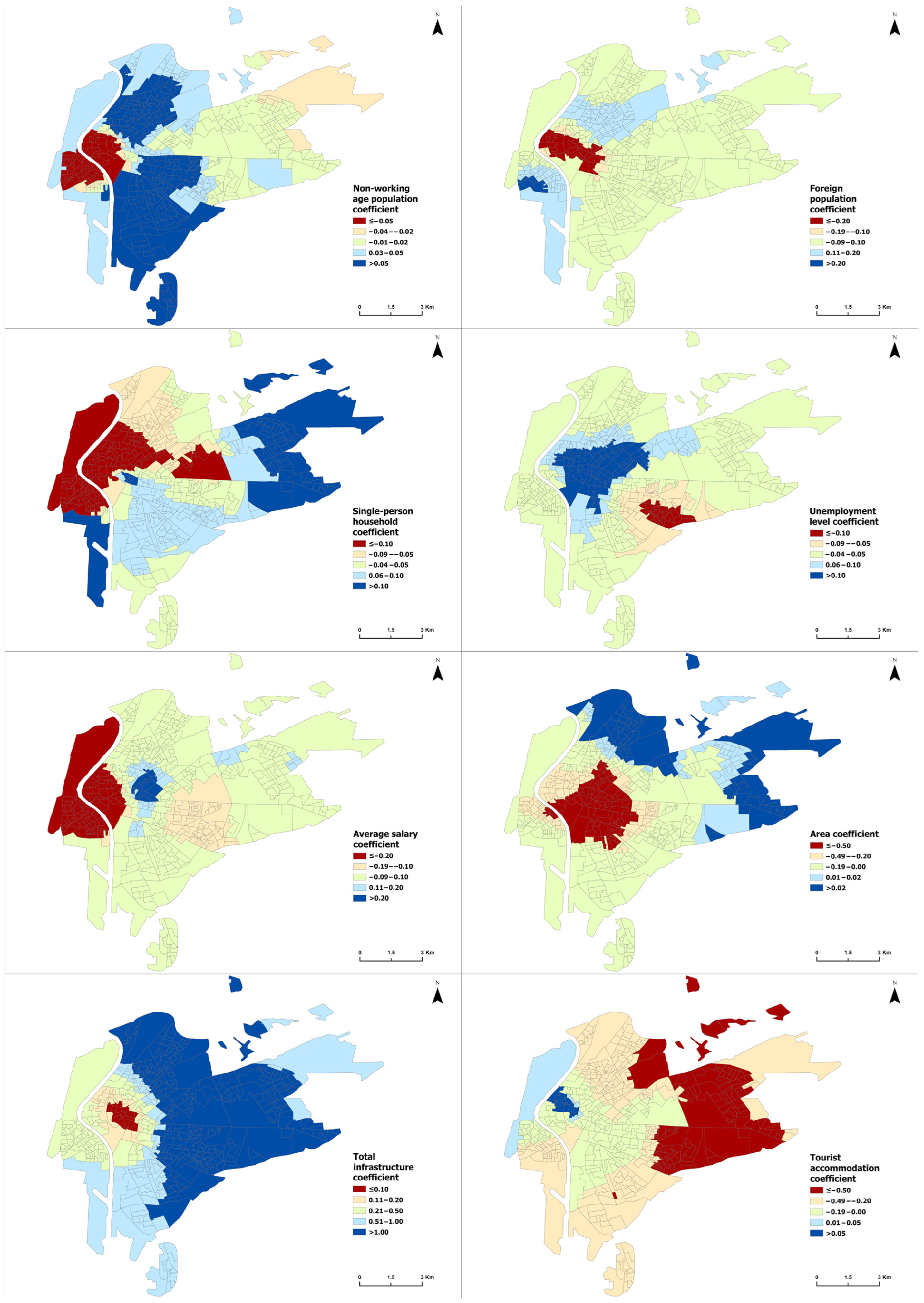43]. This model yields local coefficients that reflect the influence of the studied variables on the 15-min city concept and identifies areas where each variable individually has a higher or lower explanatory power [