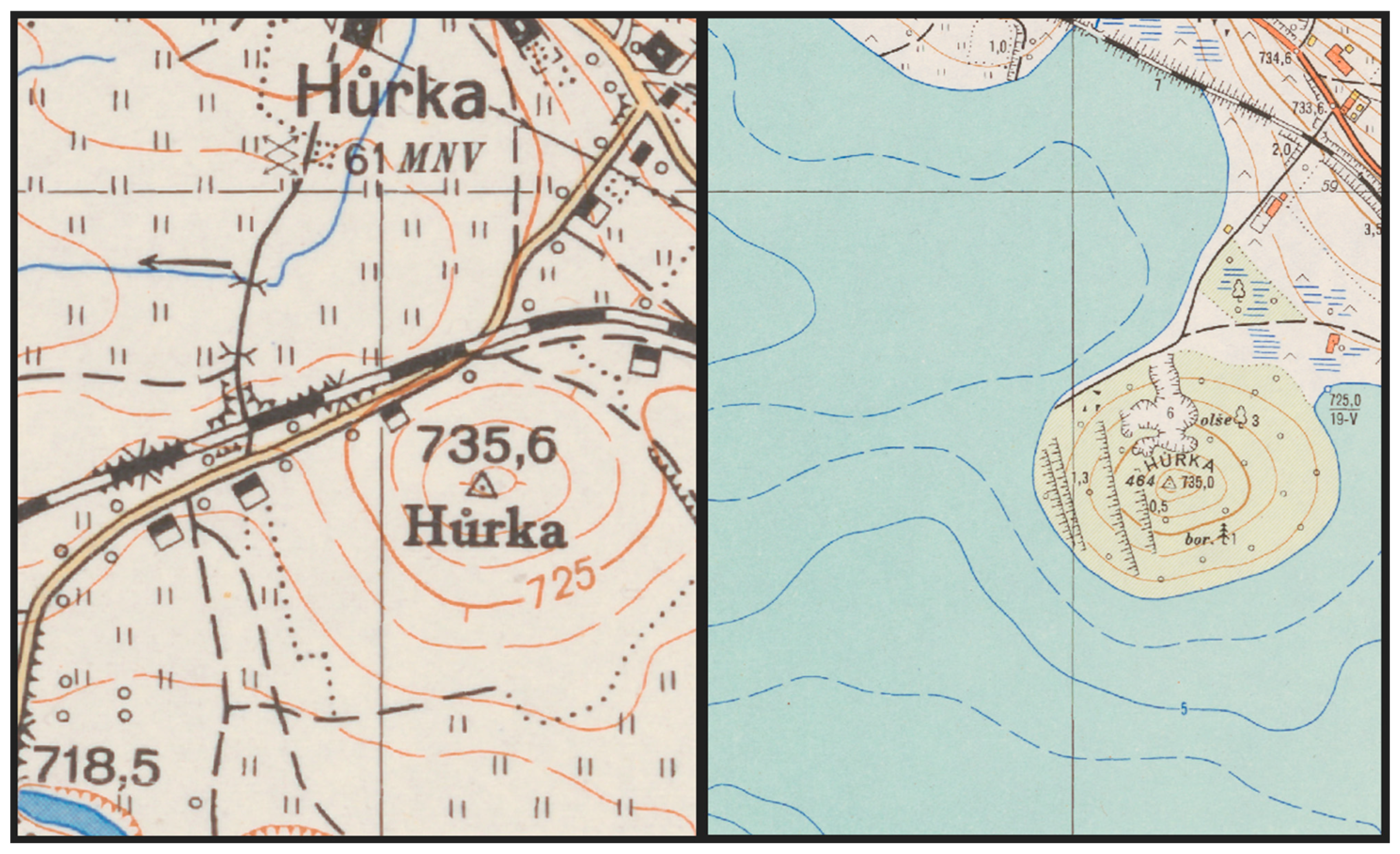 The map series used in this study are TM10 and TM25, i.e., Topographic Maps of scale 1:10,000 and 1:25,000, covering identical area. A TM25 sheet consists of four TM10 sheets. TM10 maps were created in the years 1957–1971 with base elevation interval of two (sometimes five) meters. The symbology consists of seven colors and overall, 6432 map sheets were created for the area of former Czechoslovakia. TM25 maps are older, dating to 1953–1957 period, with five-meter base elevation interval and 1736 map sheets total. Given that the TM25 map sheets covering area of interest were drawn in 1954, the dam is not present yet, whereas TM10 map sheets come from the sixties with the dam already depicted. Both of these map series were created mostly with aerial photogrammetry, and both are in S-52 coordinate system used by the Warsaw pact armies.