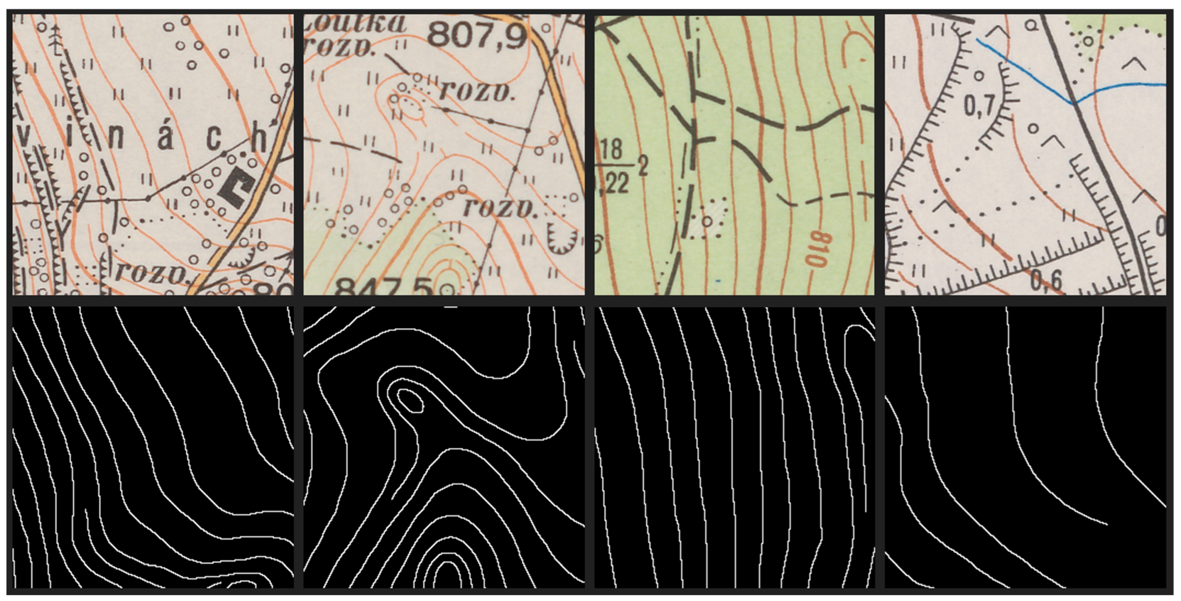 27] model with subsequent postprocessing to vectorize elevation contours from scanned topographic maps (specifically the SMO-5 “State Map 1:5000-Derived” series). That method improved robustness against noise, reduced topological errors, and lowered the manual workload compared to older thresholding-based and semi-automatic techniques.