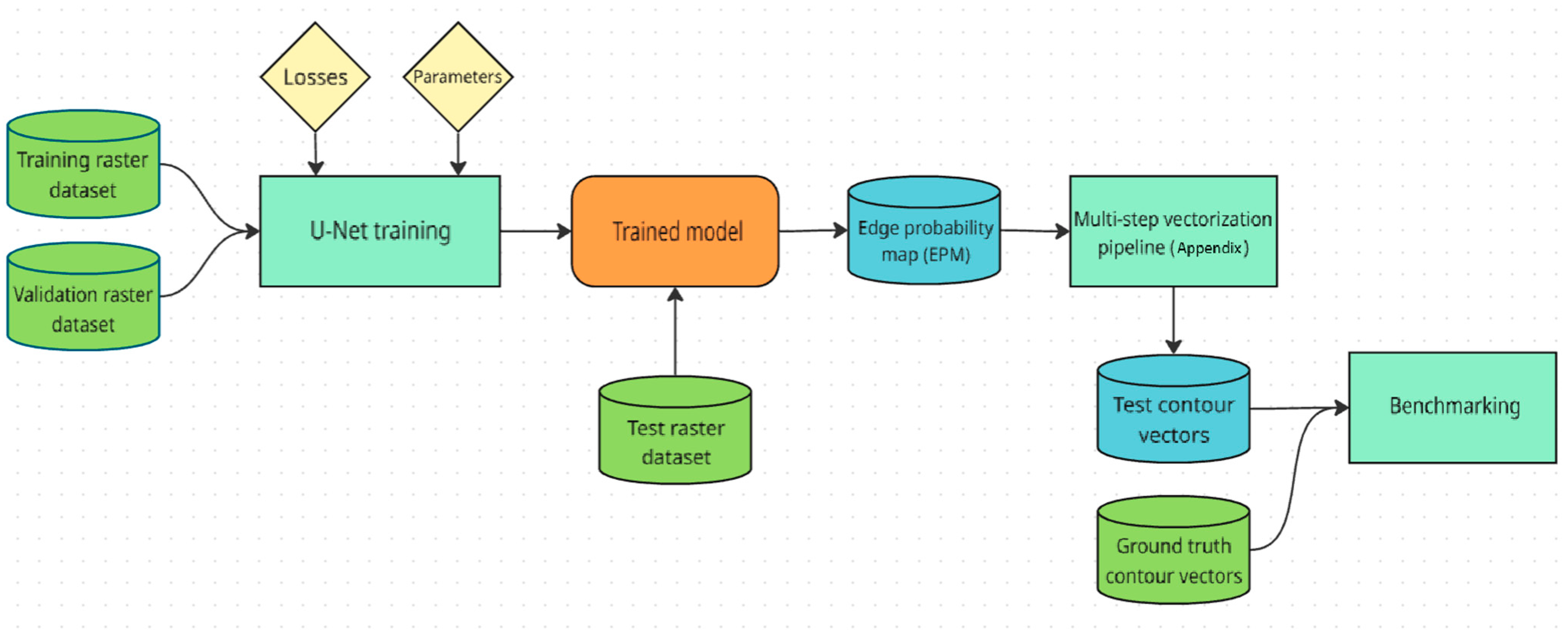 Figure 5. The final trained checkpoint is inferred on the test split belonging to the particular version of the dataset. For each particular datasets, inference follows the size of receptive field set in the training, 256 pixels for 300 DPI data, 512 pixels for 600 DPI data. The result is an edge probability map (EPM) of the area. To process the EPM raster into vector, we make use of the recently proposed multi-step vectorization pipeline, in detail described along with minor changes in
