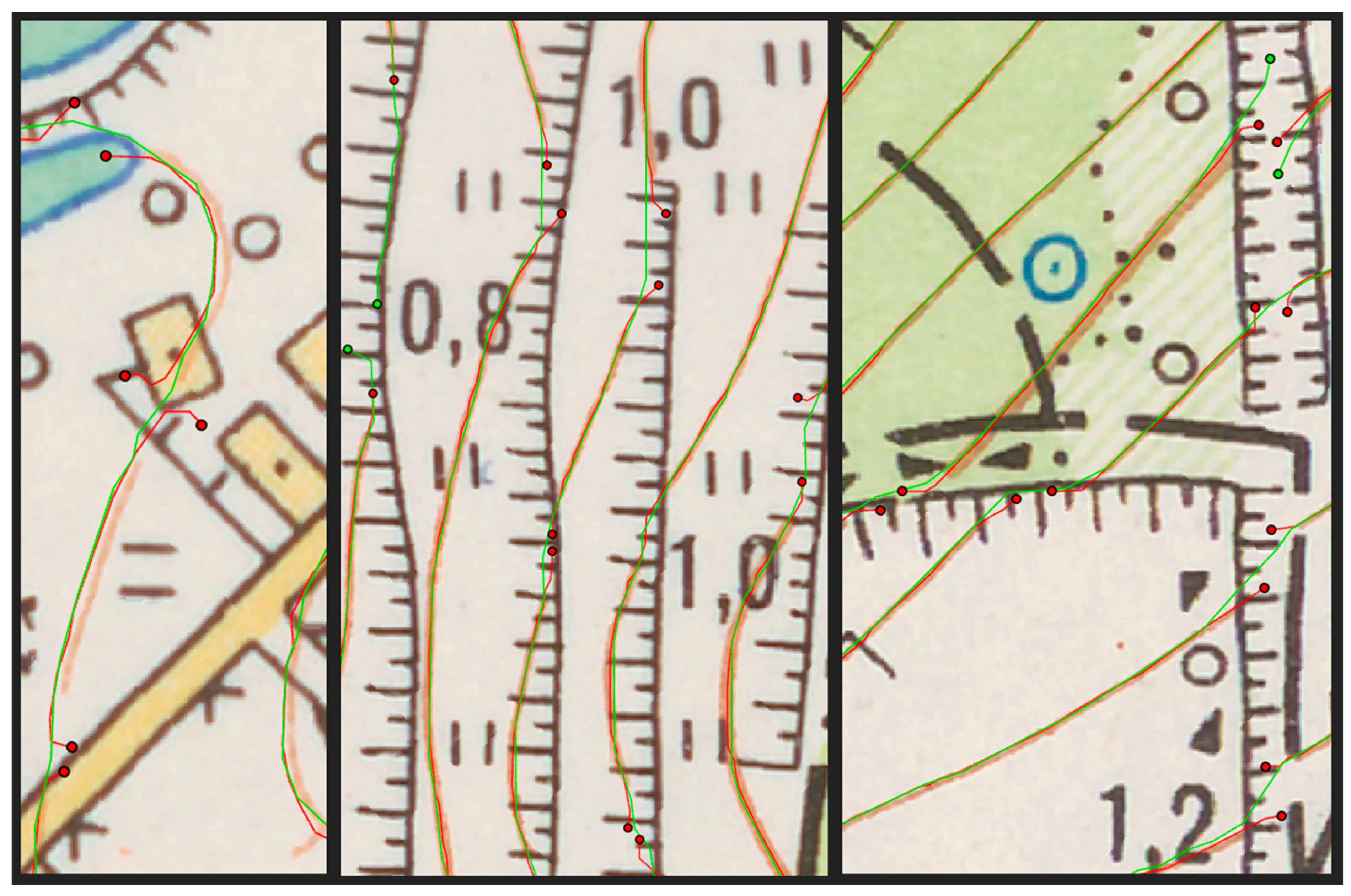 Evaluation takes place after vectorization, where we compare positional accuracy and topological correctness of the resulting vector contour map. Given differing spatial and spectral resolutions we can expect differences in omission/commission errors. To quantify topology, we use previously defined methodology: counting intersections and dangling ends, while deducting dangling ends occurring also in the ground truth vector. Errors located near outer borders of the raster are also disregarded. Resulting counts give a general idea about topological consistency and amount of work necessary for manual correction.