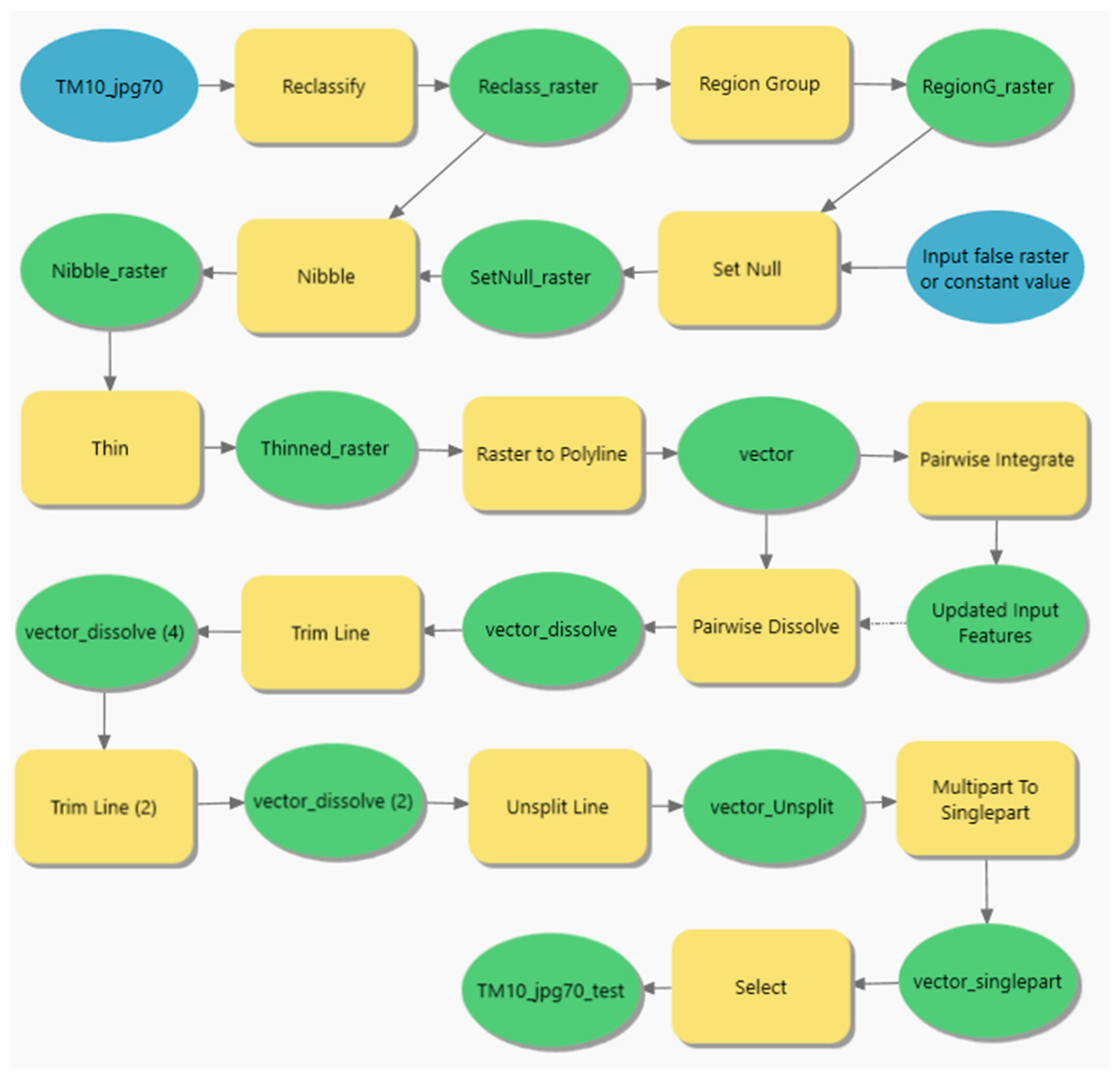 Pipeline from EPM raster to vectorized contours as conceived in ArcGIS 3.3 ModelBuilder. “Reclassify” step represents thresholding, the binary raster is then grouped by connected regions, and regions smaller than 400 are dissolved into the surrounding value. The raster is then thinned and converted to a polyline (with simplification). Vertices in mutual proximity are integrated; the dangling lines are trimmed (twice) and connected line elements are merged into one (unsplit). Finally, small segments are discarded.
