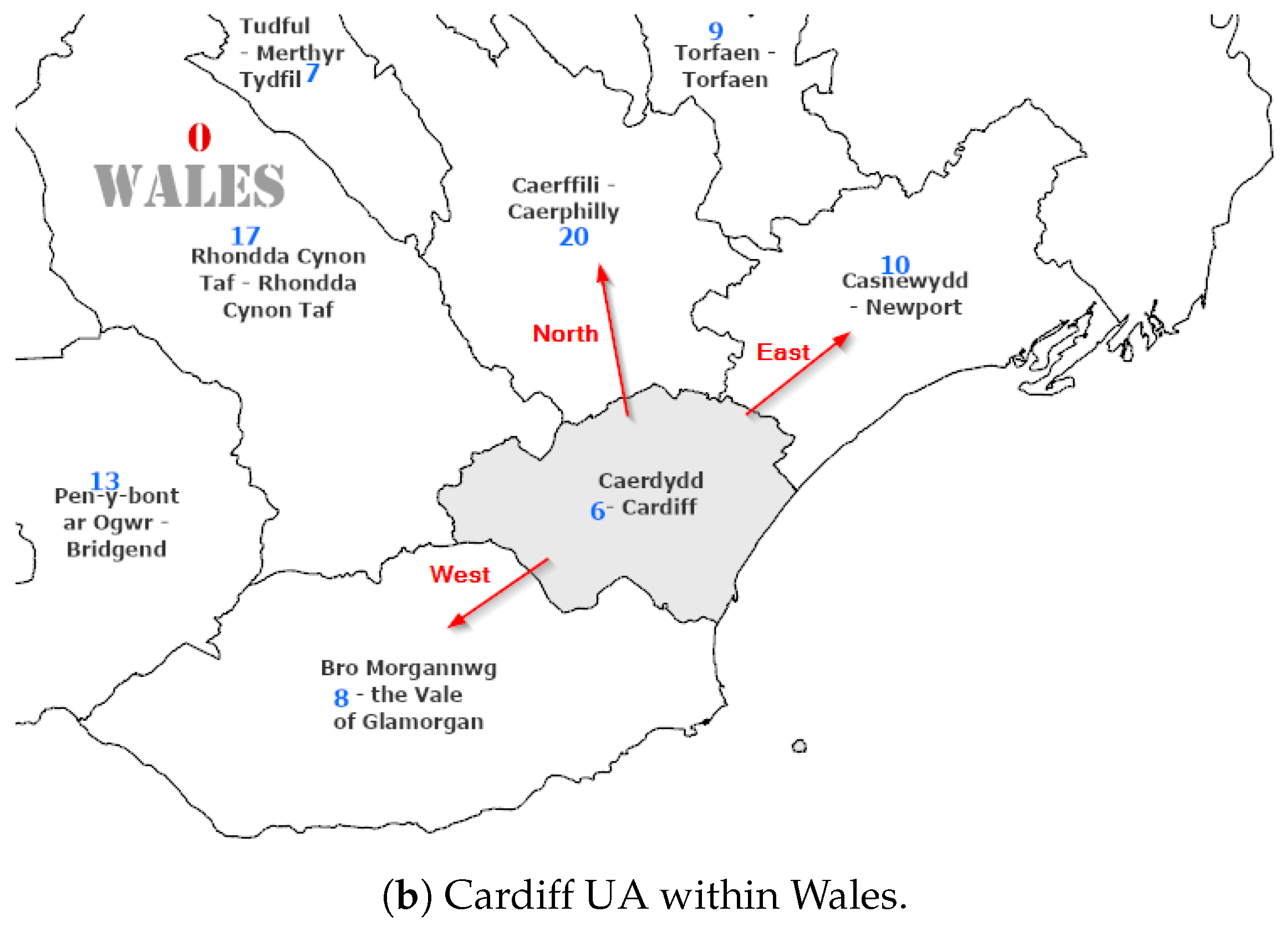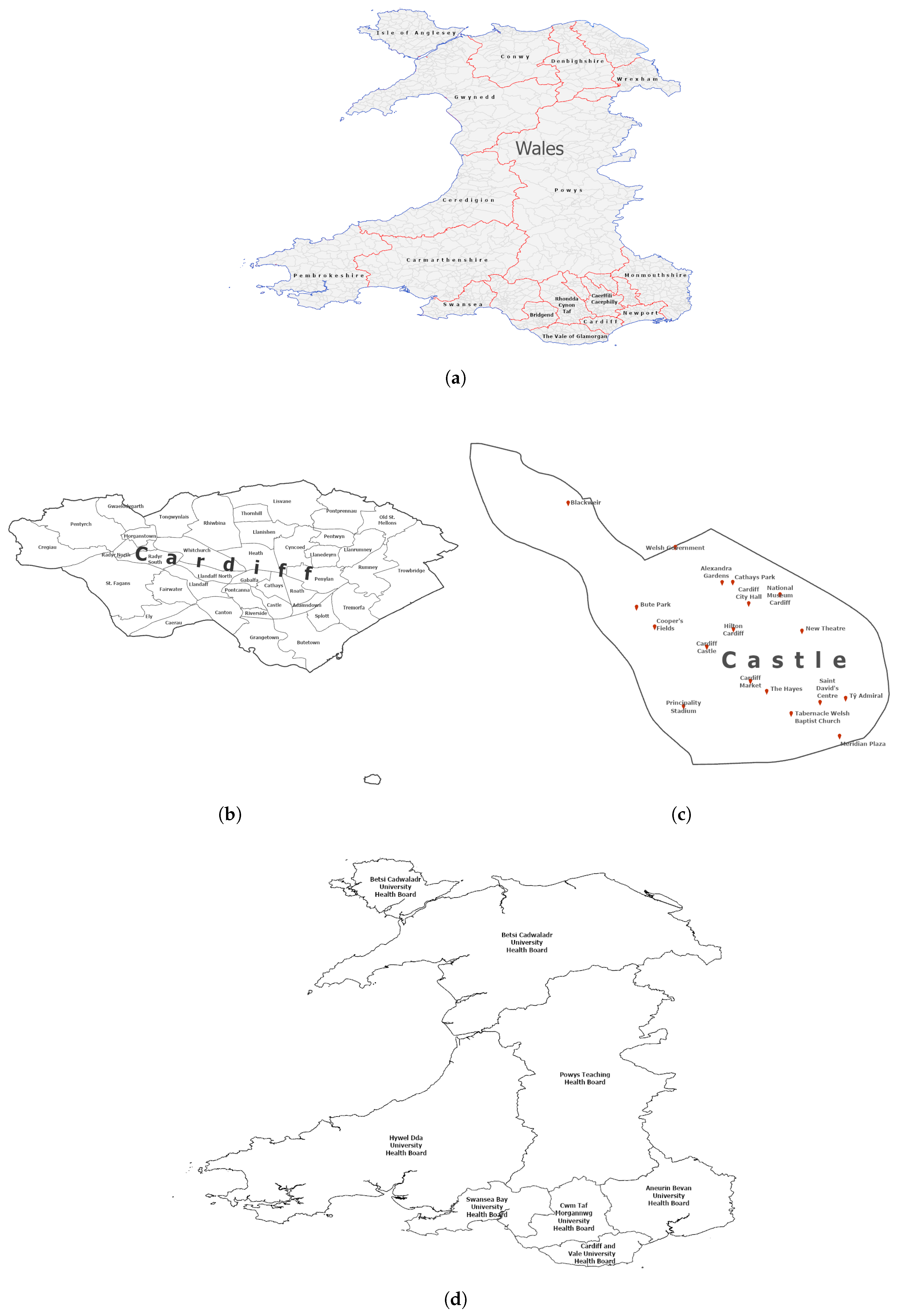 Figure 1 show two adminstrative hierarchies of the Wales, Uk; Unitary Authorities (a) and Health districts (d).