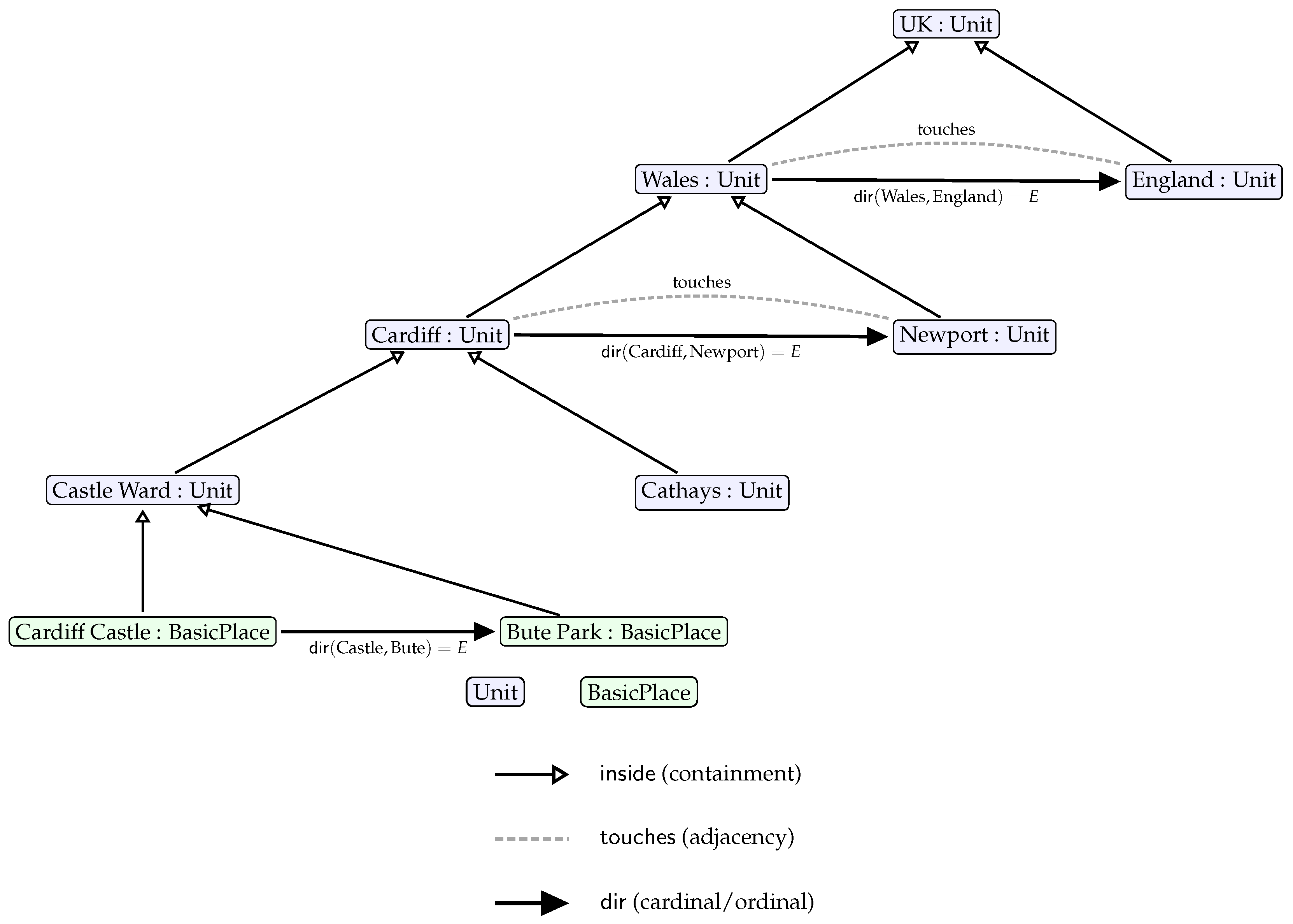 Consequently, each place’s spatial location is uniquely identified through two complementary mechanisms: A containment path extending from the root unit to its immediate container, and its lateral neighbourhood relationships at the corresponding hierarchical level. This dual characterization enables both hierarchical reasoning (through containment chains) and lateral reasoning (through neighbourhood relations).