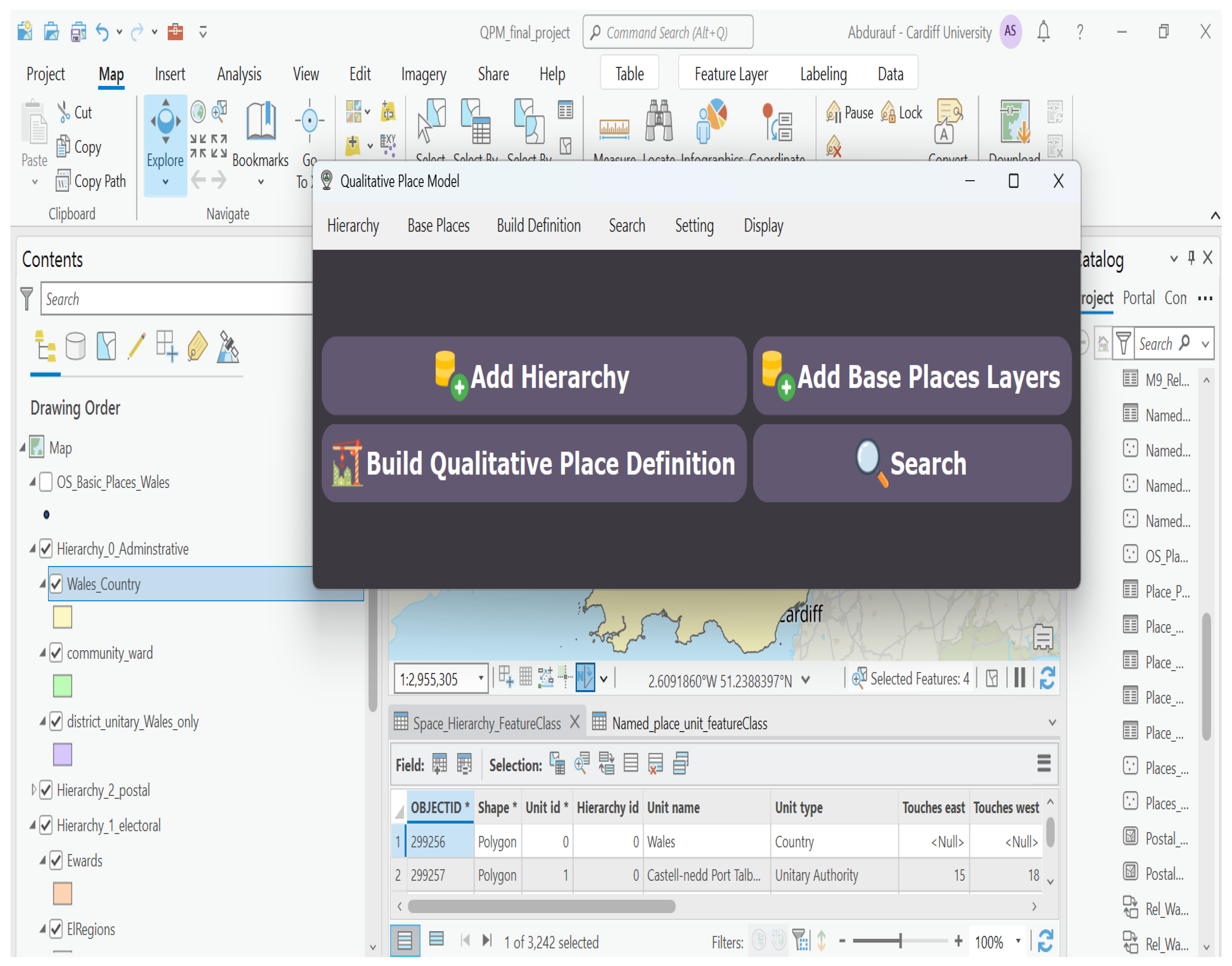 9]. However, these research directions often remain external to operational GIS: QSR models are frequently demonstrated on abstract datasets or external knowledge graphs, while most GIS platforms lack a homogeneous, in-platform model that treats geographic places uniformly, and implements end-to-end computation, storage, and querying of qualitative place descriptions within the GIS environment.