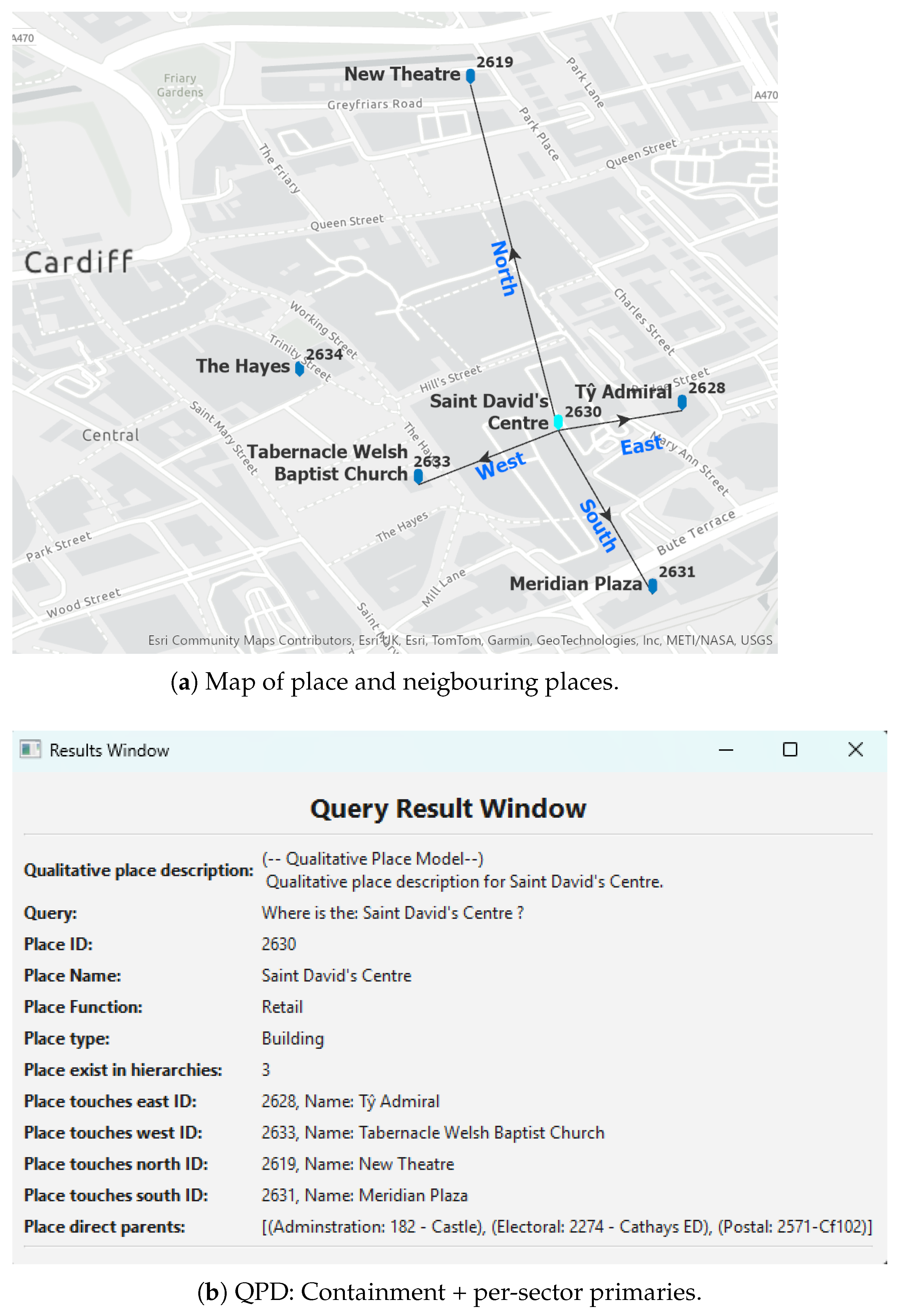 2]. In everyday communication, humans answer where? questions qualitatively by combining names, hierarchies, and relative positions (e.g., “Cardiff University is east of the Wales Police Station, inside Cathays ward”) [