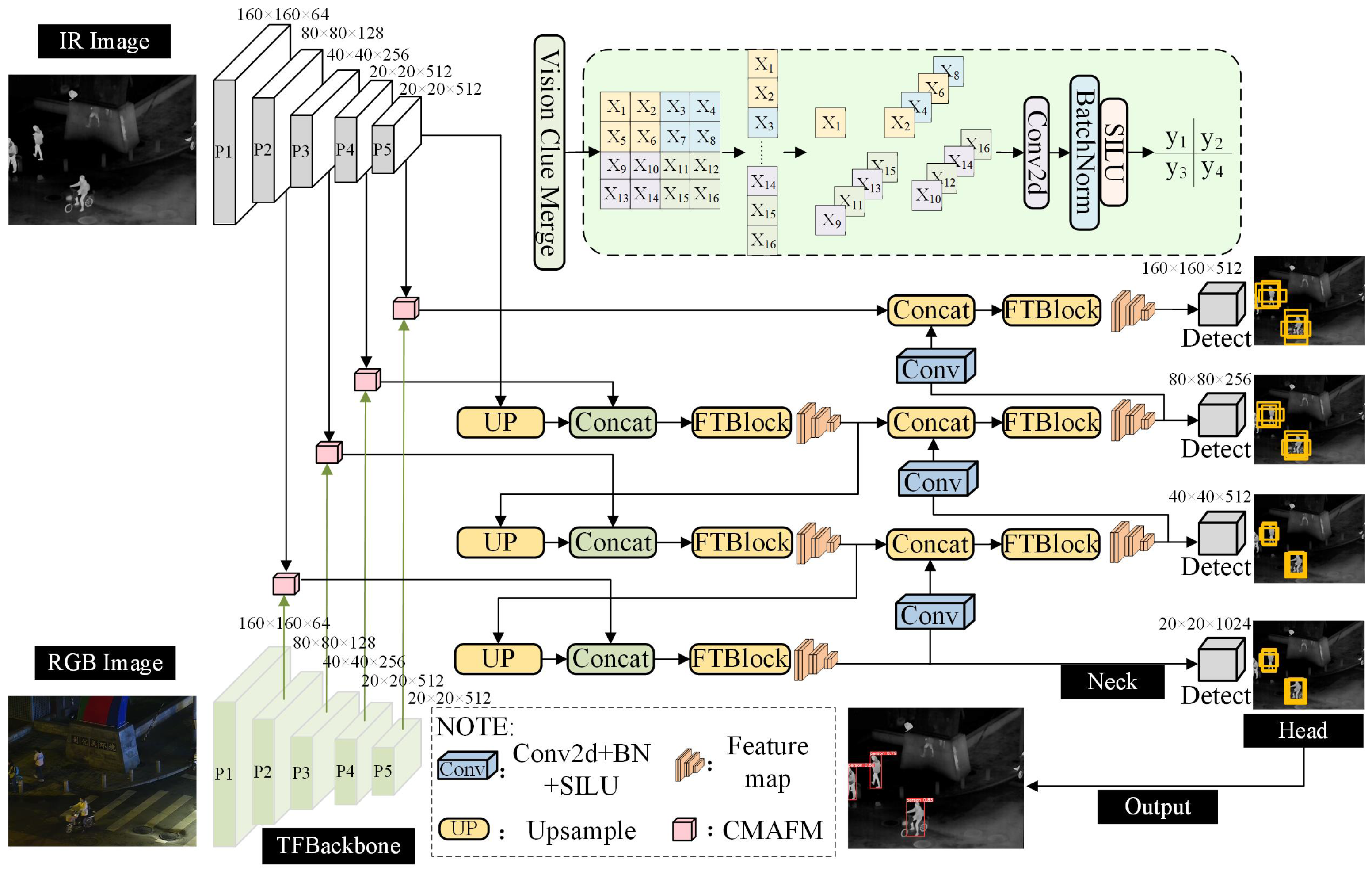15]. These modalities are inherently complementary: visible images provide structural details, while infrared images offer thermal contrast. Effective fusion can exploit this complementarity to enhance feature representation and improve detection robustness in complex conditions. However, naive fusion strategies may introduce modality noise or redundant information. Furthermore, conventional CNN-based fusion networks struggle to capture long-range contextual dependencies, which are crucial for discriminating pedestrians from cluttered backgrounds.
