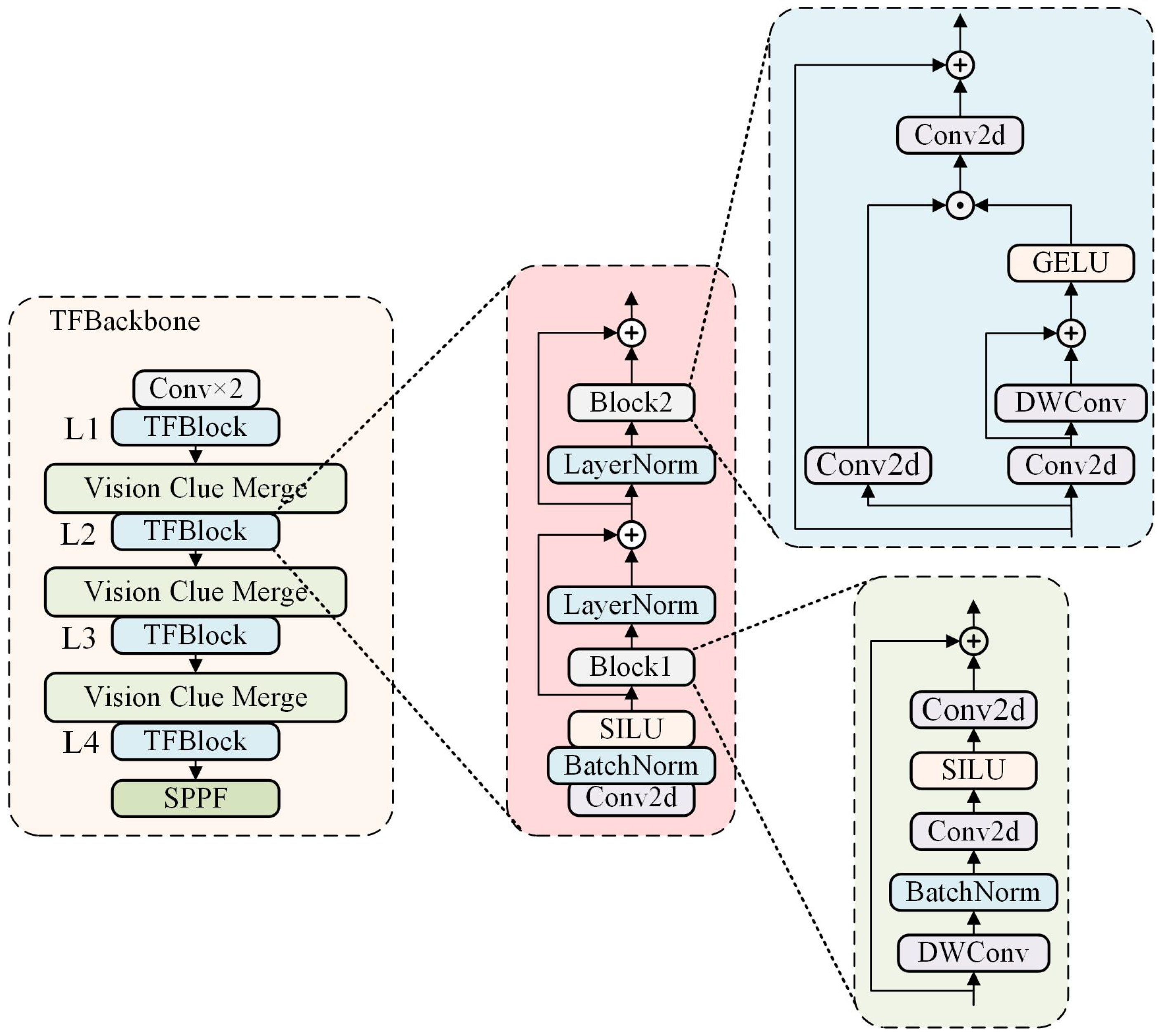 TFBackbone Architecture. The backbone consists of multi-stage TFBlocks, Vision Clue Merge modules for resolution adjustment, and a final SPPF layer for context aggregation.