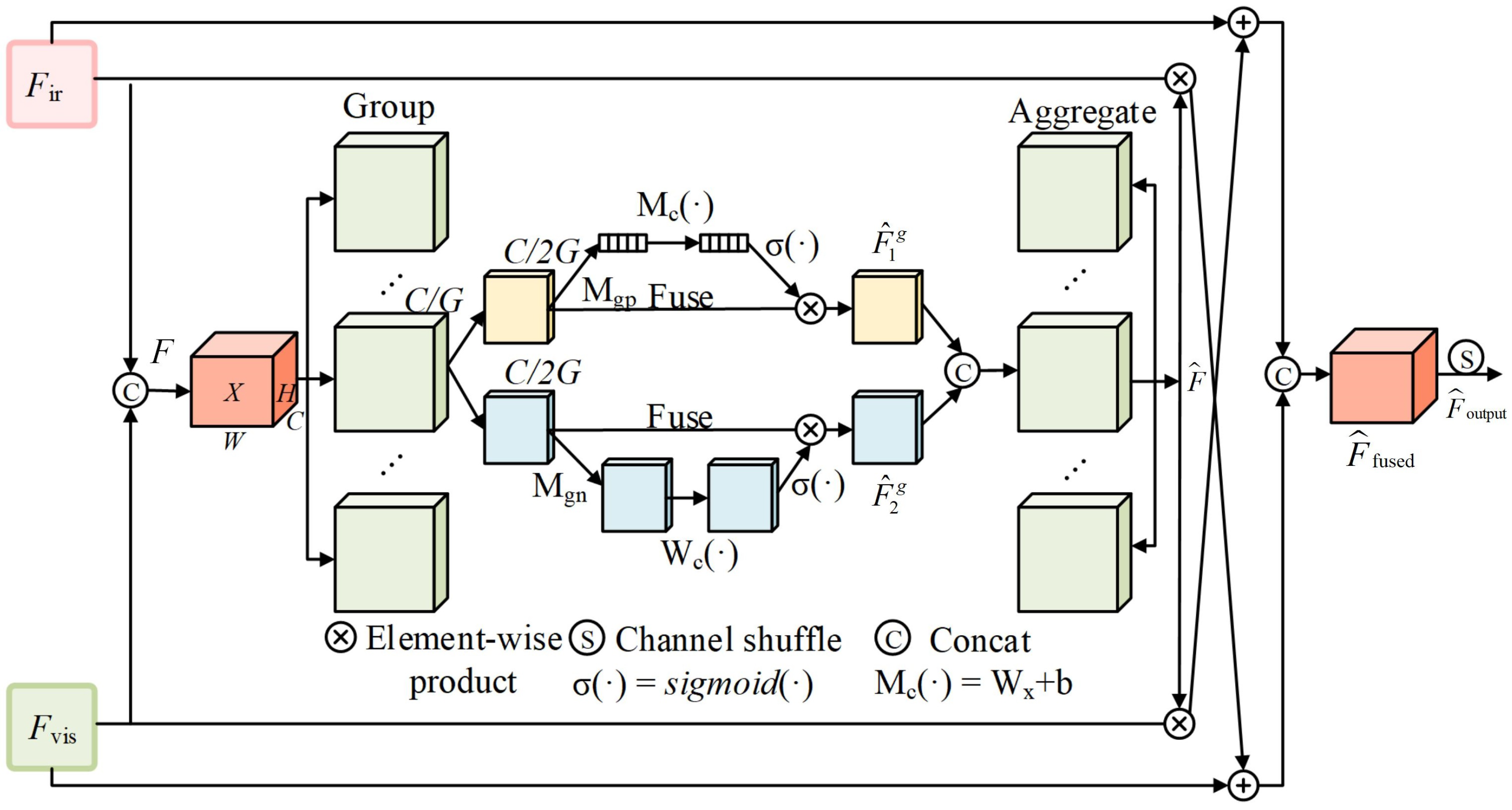 Architecture of the Cross-Modality Attention Fusion Module. Given the concatenated visible and infrared features, the module splits them into multiple groups, each processed by two parallel attention branches. Channel-wise and spatial relationships are modulated via GAP and GroupNorm, followed by modality-guided fusion. This design enhances discriminative feature selection while suppressing modality-specific noise.