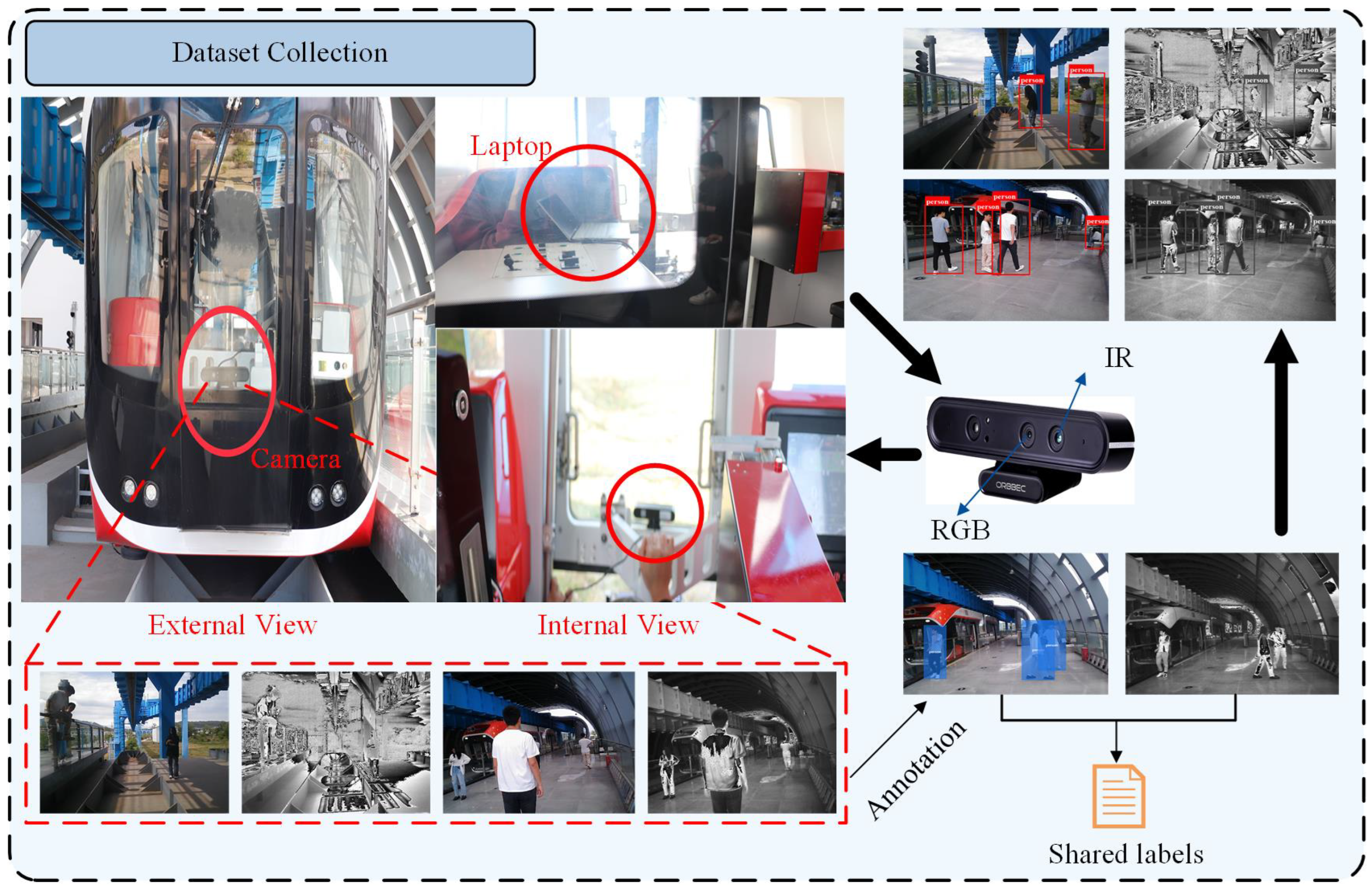 Acquisition process of the HGPD dataset. An Orbbec Astra Pro sensor with RGB and IR cameras is mounted on the front of the monorail cabin and connected to a laptop for synchronized recording. Paired RGB–IR frames are sampled from the recorded videos and later annotated with pedestrian bounding boxes using shared labels for both modalities.