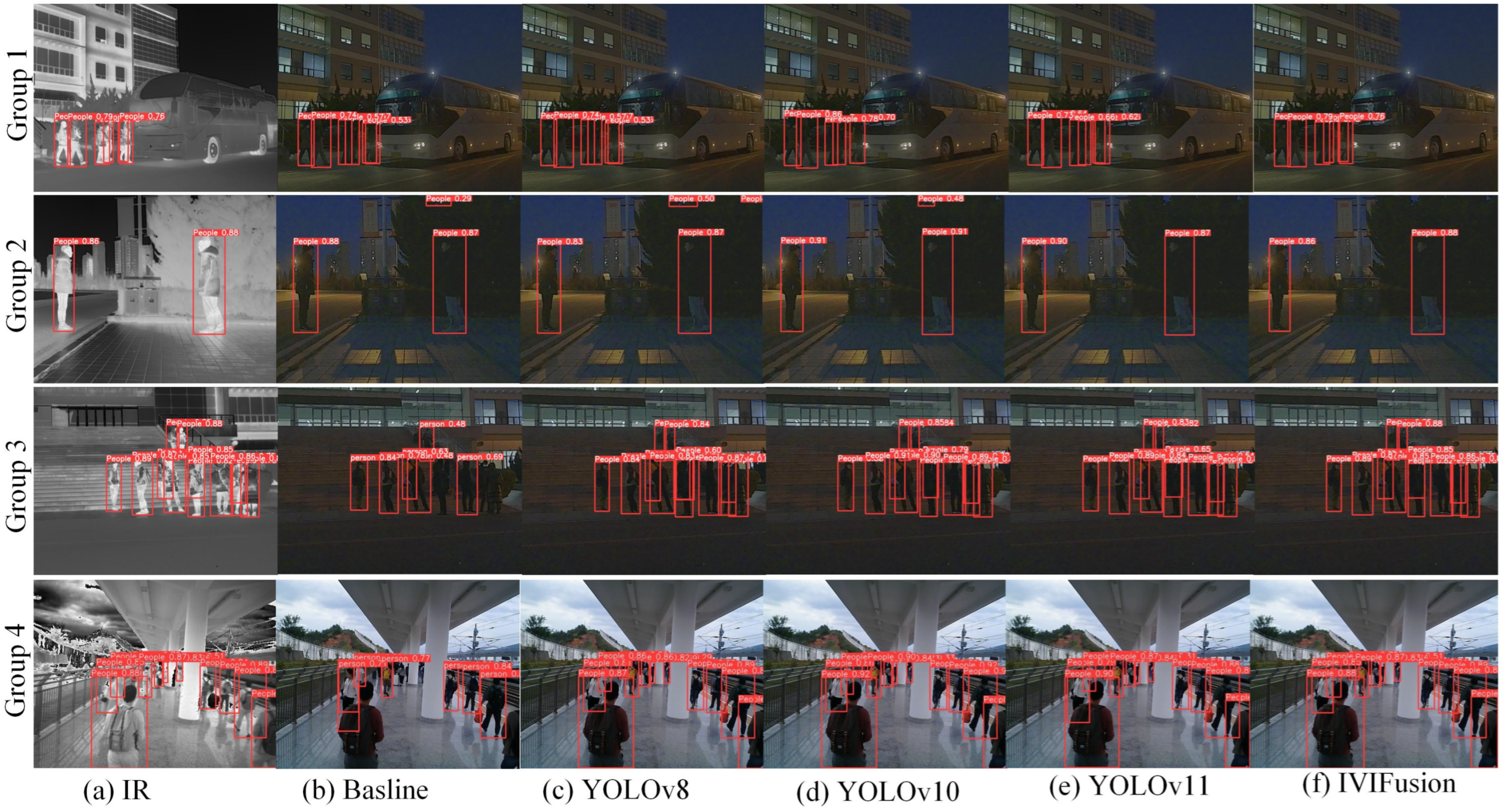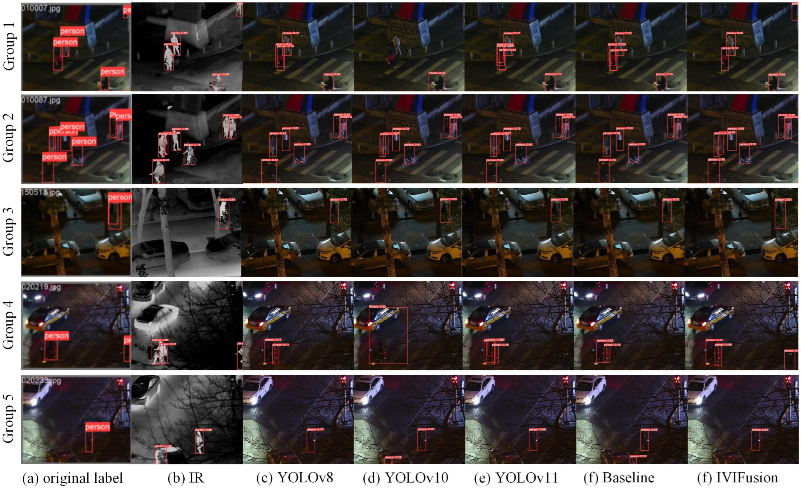 Visual comparisons on the LLVIP dataset. (a) Ground Truth, (b) IR-only, (c) YOLOv8-RGB, (d) YOLOv10-RGB, (e) YOLOv11-RGB, (f) Proposed IVIFusion.