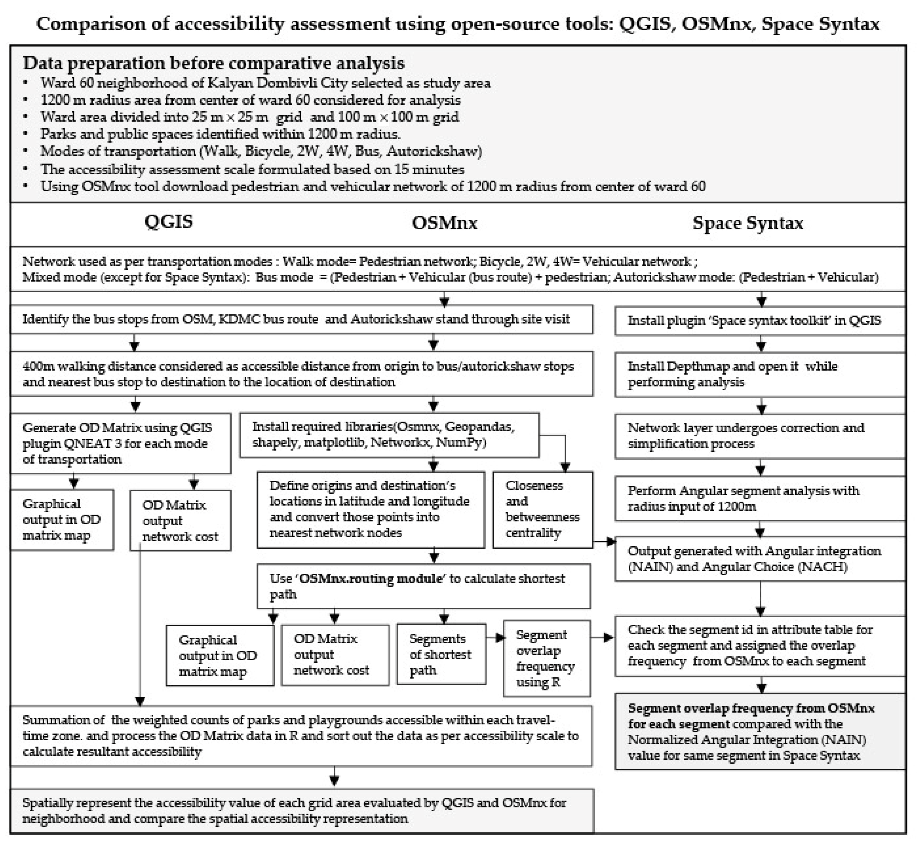 2.4. Accessibility Assessment by QGIS, OSMnx, and Space Syntax