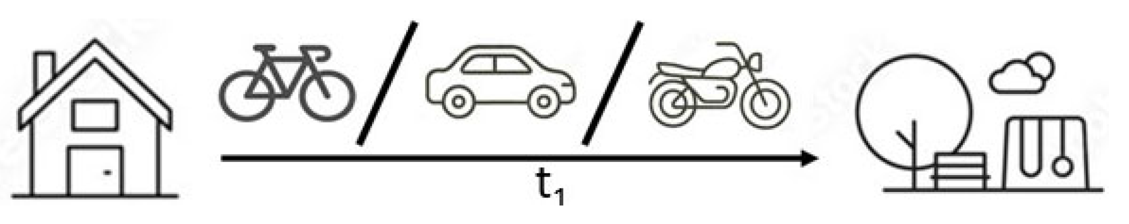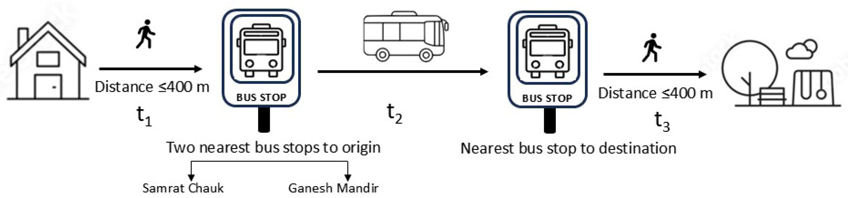 | Bus | 4.7 | Pedestrian | ODb1 | Origin → bus stop closest to homes (BS1) | t1 | – | t1 + t2 + t3 |
