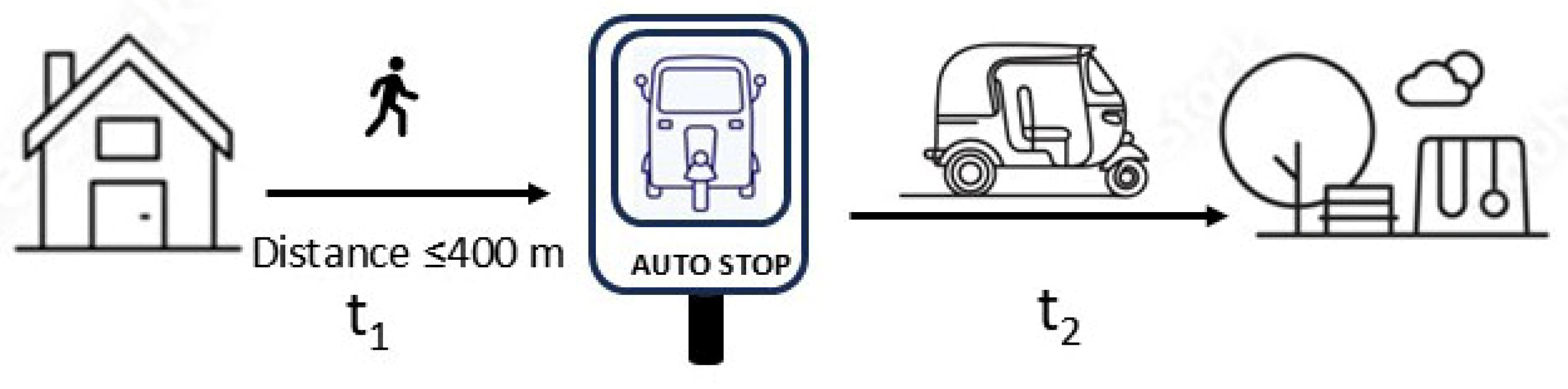 | Auto- rickshaw | 4.7 | Pedestrian | ODa1 | Origin → Autorickshaw stop | t1 | – | t1 + t2 |