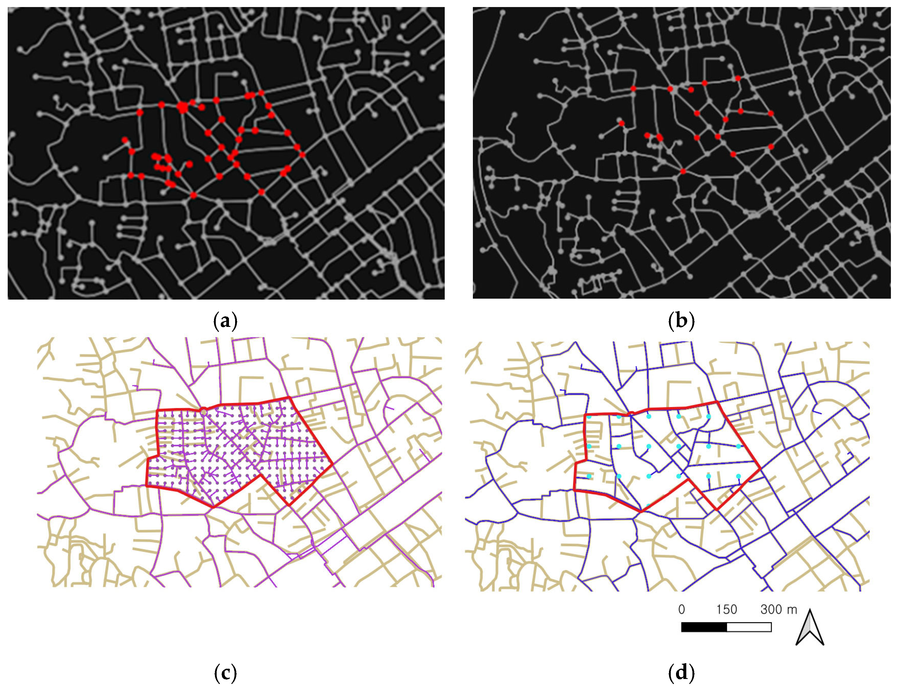 - Boeing, G. OSMnx: New methods for acquiring, constructing, analyzing, and visualizing complex street networks. Comput. Environ. Urban Syst. 2017, 65, 126–139. [Google Scholar] [CrossRef]