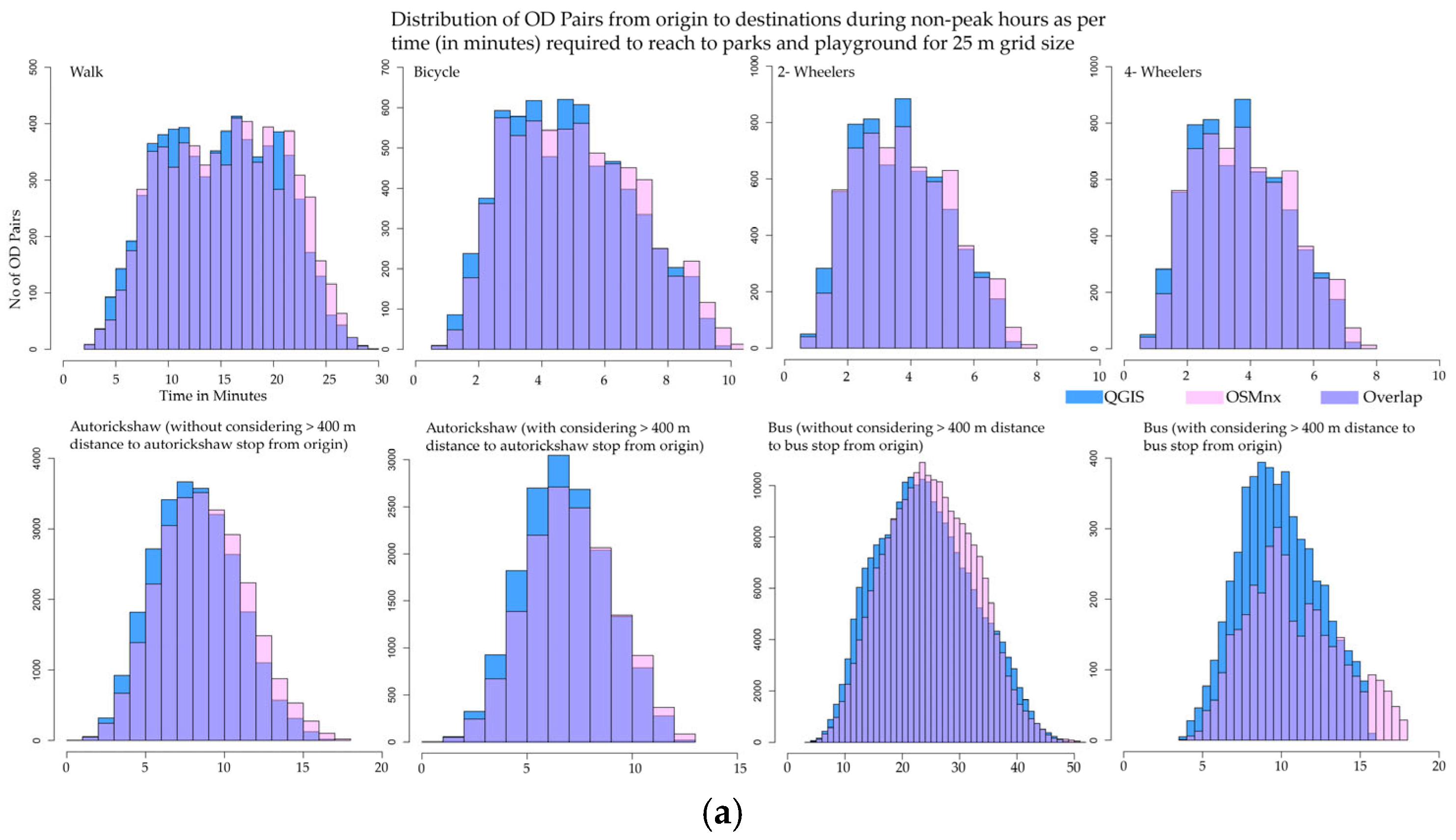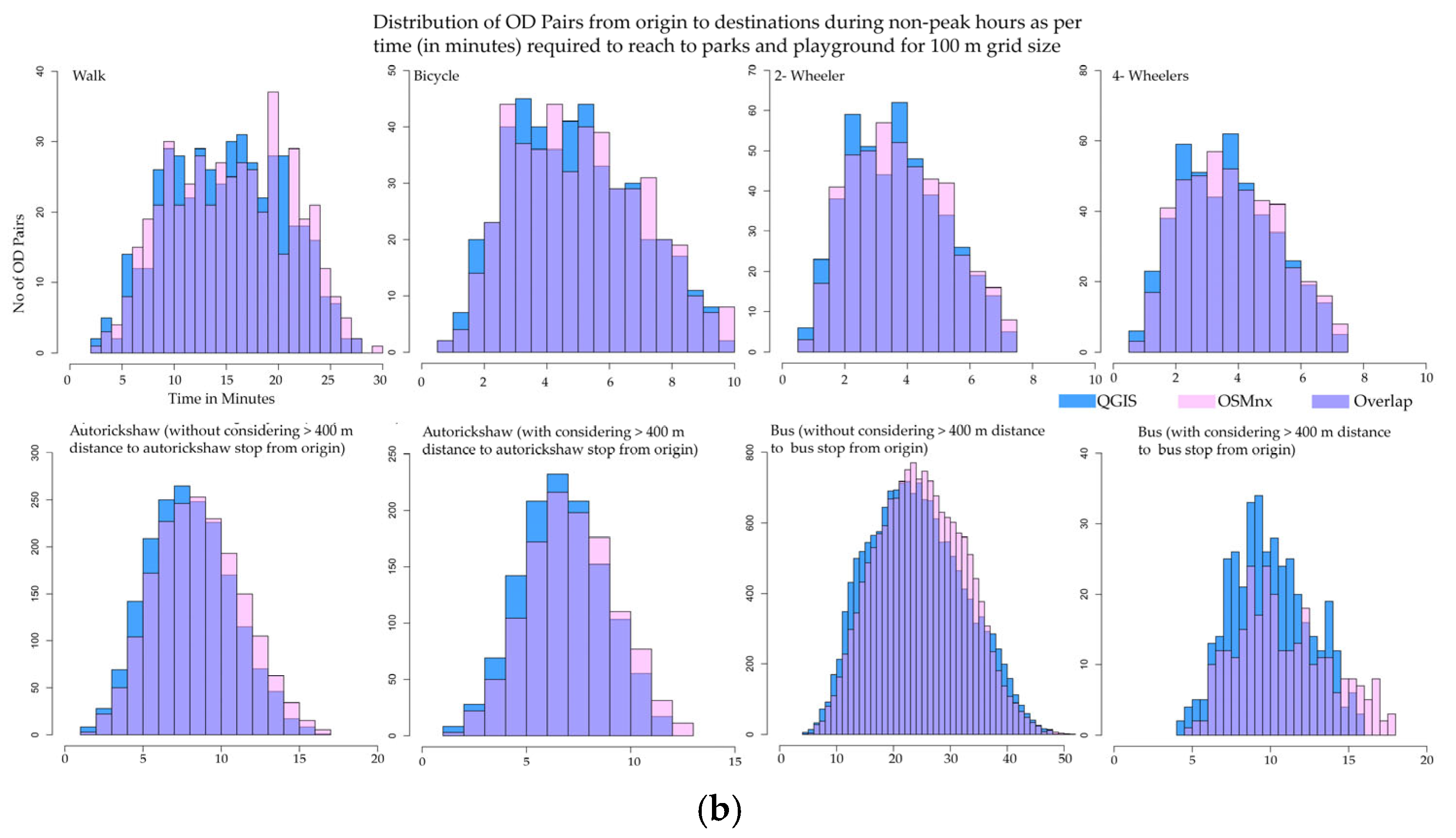 3.1. Method-Wise Comparison of Accessibility Assessments by QGIS and OSMnx