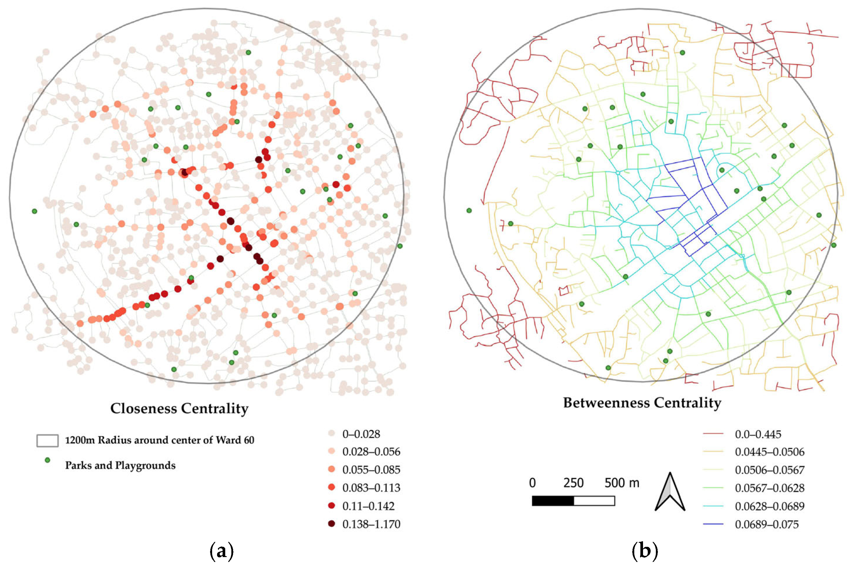 3.6. Closeness Centrality and Between Centrality Results by OSMnx